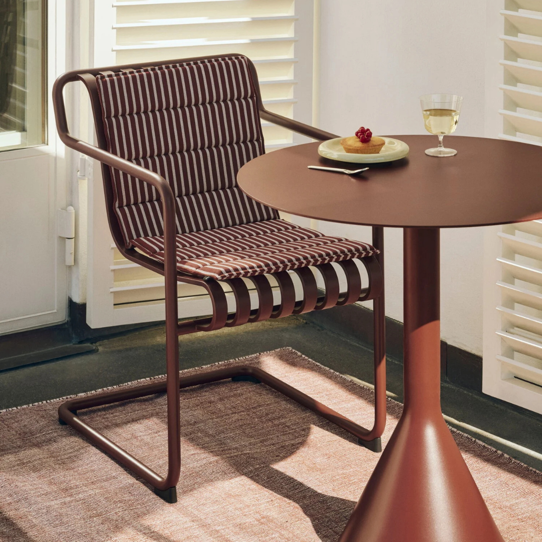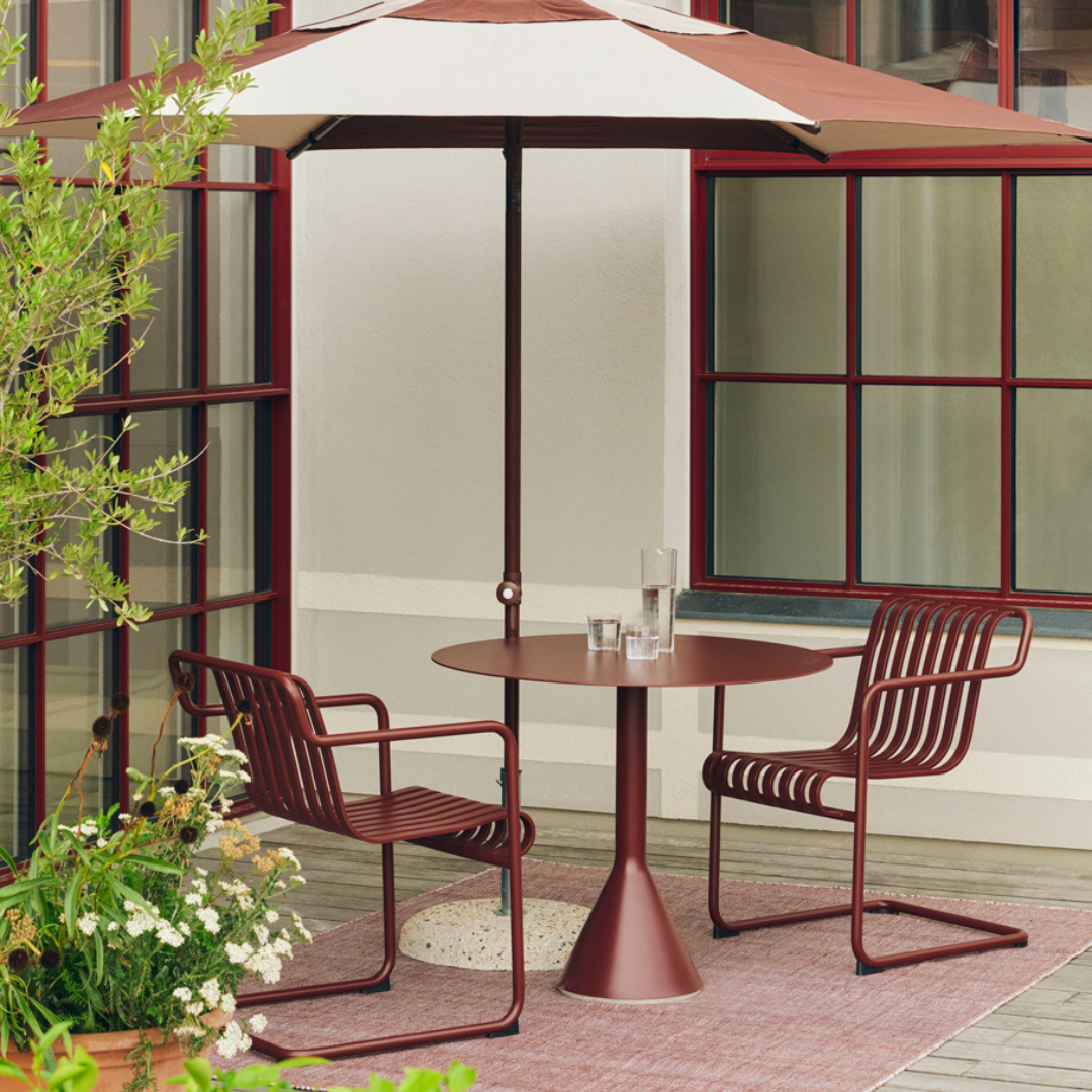De slanke maar robuuste Palissade-cone-tafel maakt deel uit van Hay's veelzijdige collectie tuinmeubilair. Palissade tuinmeubilair heeft een sterk, grafisch ontwerp dat bestaat uit eenvoudige stalen buizen en lamellen. Ronan en Erwan Bouroullec werkten twee jaar aan deze collectie en creëerden een reeks eenvoudige, uitgebalanceerde stukken die zeer geschikt zijn voor terrassen, balkons, tuinen, cafés en openbare ruimtes. De Palissade stoelen, tafels en banken zijn stevig maar ook elegant en perfect voor gebruik buitenshuis, omdat wind en water door het frame van gegalvaniseerd staal gaan.