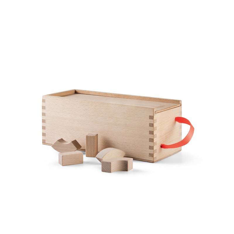 Een doos van alfabet blokken met 33 gebogen en 33 rechte blokken.
