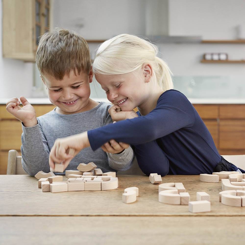 Met dit in het achterhoofd, werden de alfabetische blokken gemaakt in twee verschillende vormen die, in combinatie, alle letters van het alfabet kunnen vormen.