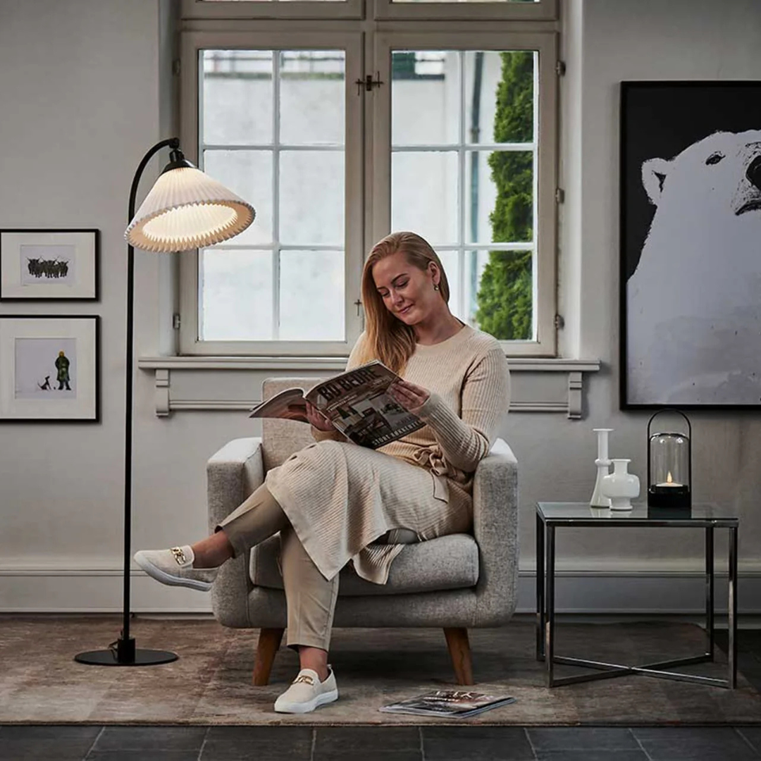 Nog steeds is deze vloerlamp de bestverkochte lamp tot nu toe, de 368 vloerlamp combineert Aggers esthetiek en Le Klints met de hand geplooide kap om een tijdloos en iconisch ontwerp te creëren.