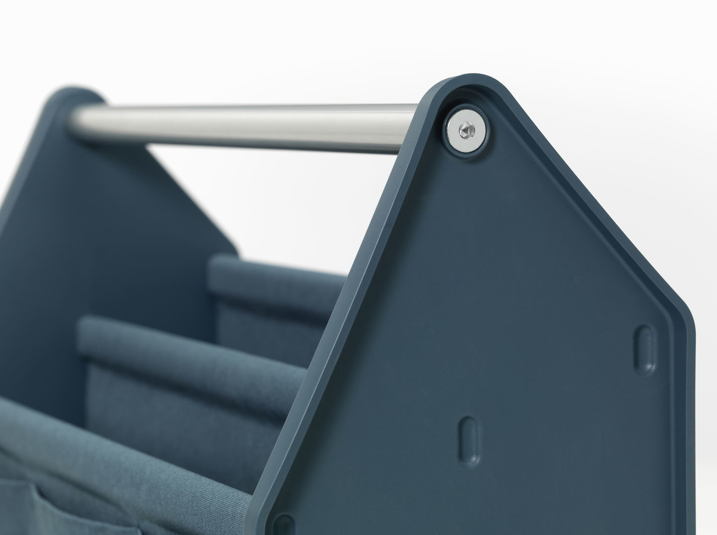 De constructie van de Locker Box is eenvoudig en robuust. Twee zijwanden van gerecycled plastic zijn met elkaar verbonden door aluminium buizen. De bovenste buis is het handvat. Aan de andere vijf hangt een constructie van gelaste stukken stof, die de compartimenten vormen.