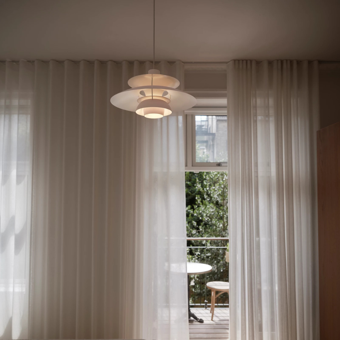 De naam van de lamp verwijst naar de ontwerper en de diameter van 50 centimeter van de grootste schijf. De Hanglamp PH 5 past perfect boven een eettafel, maar is ook bijzonder mooi op zijn plaats bij hogere montage in verschillende architecturale ruimtes lobby's / vides ed.