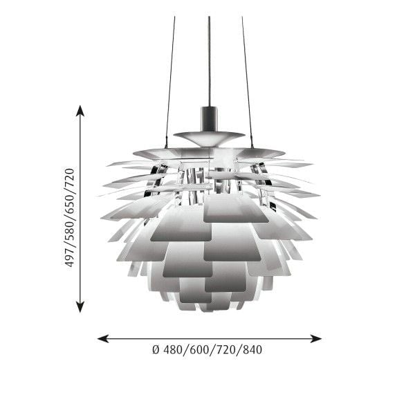 De Louis Poulsen PH Artichoke hanglampen zijn verkrijgbaar in de volgende afmetingen: Ø48 cm. - Ø60 cm. - Ø72 cm. - Ø80 cm.