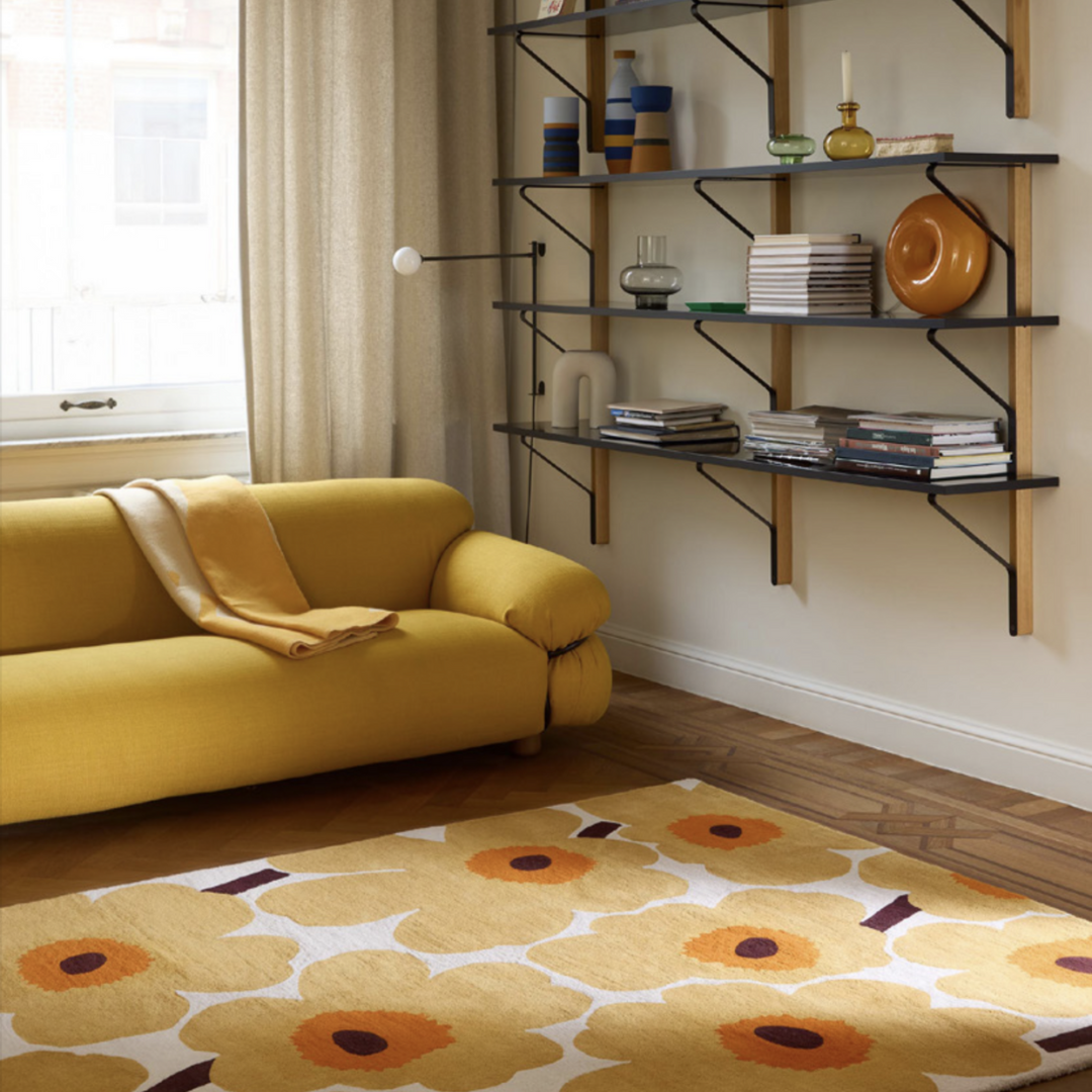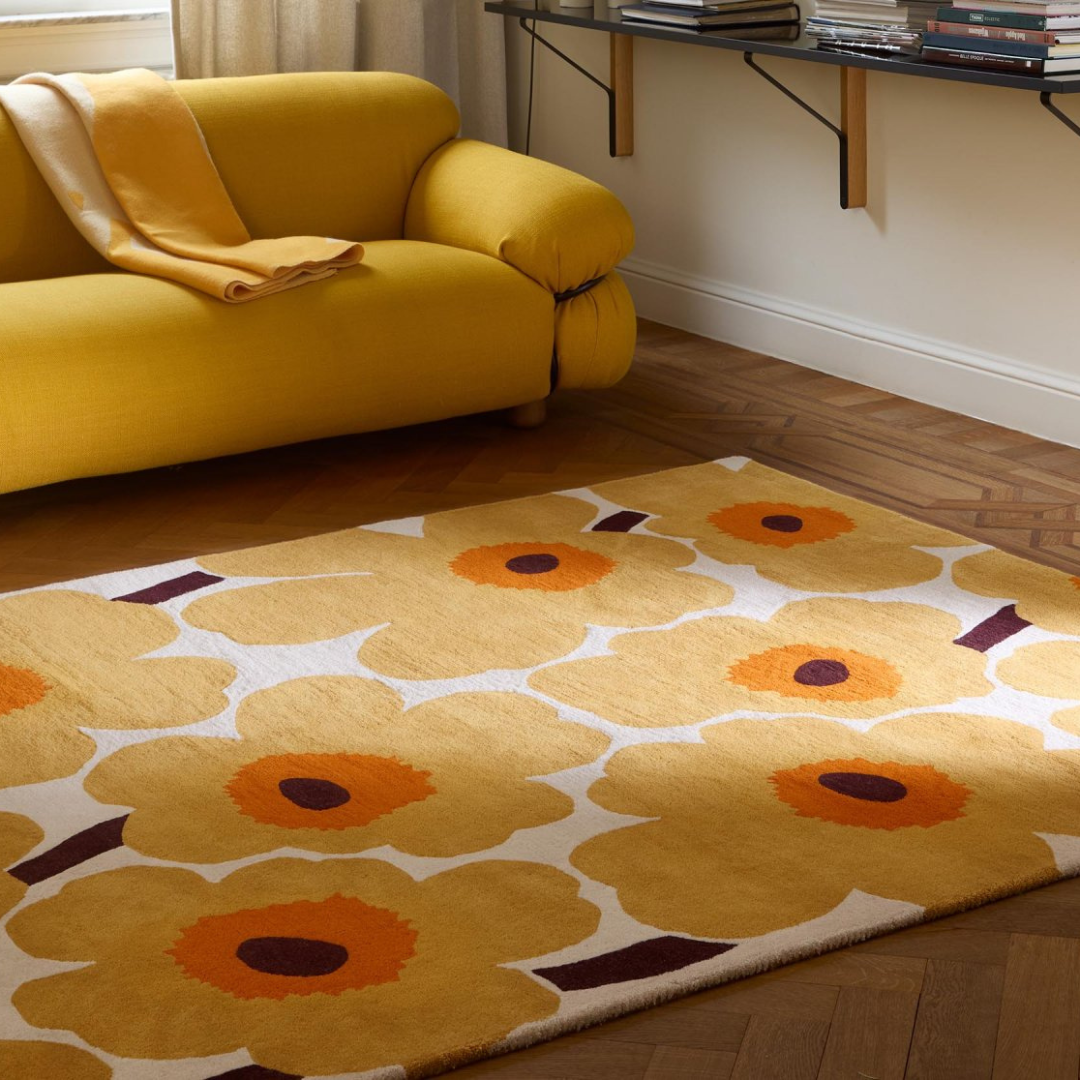Dit tapijt genaamd Unikko is versierd met het iconische Marimekko-patroon van Maija Isola. Het Unikko patroon is ontworpen in 1964.
