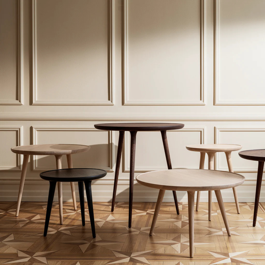 De Mater Accent serie is ontworpen door het Deense architectenduo Space Copenhagen en combineert het sculpturale met handgemaakte esthetiek. In navolging van de als zeer succesvolle bekendstaande Mater High Barkruk 2009, bestaat de Accent-collectie uit vier salontafels (s, m, l en xl) en een grotere ovale salontafel en een ronde eettafel in 2 formaten.