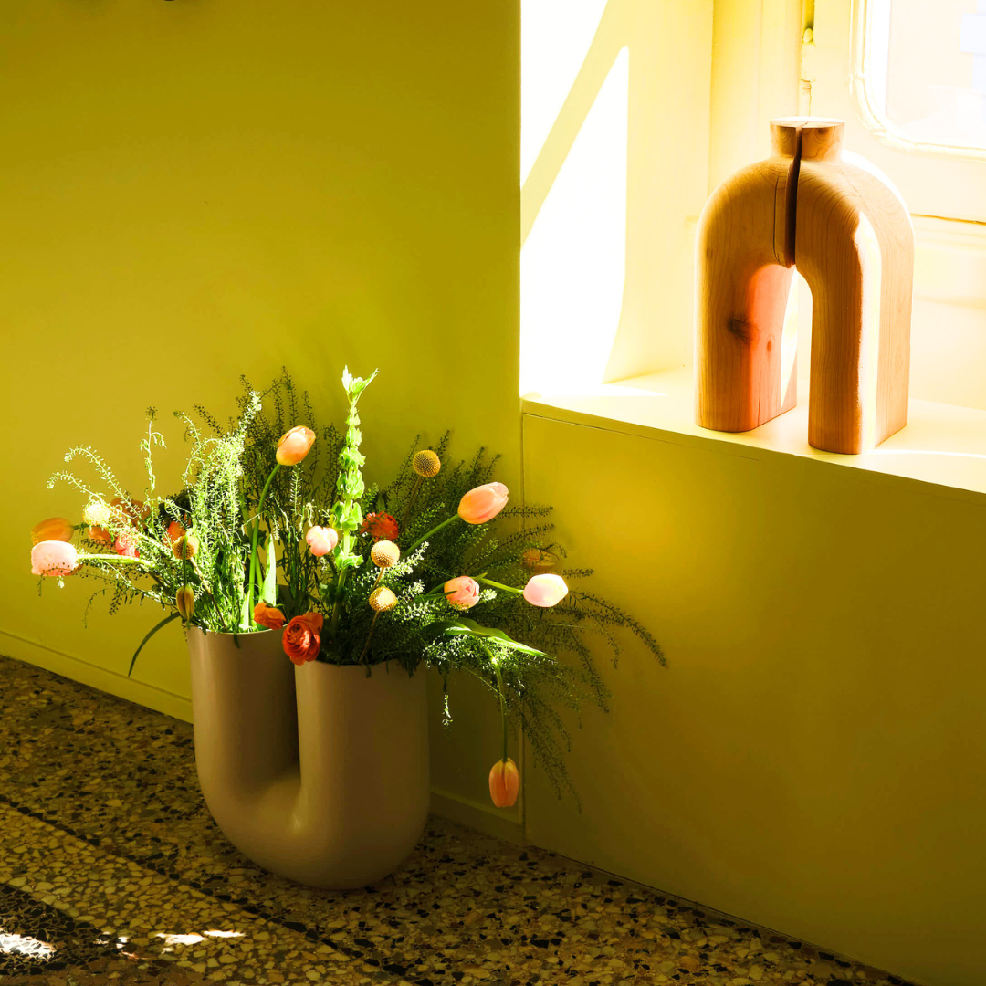 Nu verkrijgbaar in twee maten, beide perfect voor het tentoonstellen van bloemen. Gebruik de grotere Kink als opvallend vloerstuk of sculptuur, terwijl de kleinere maat geschikt is voor planken, aanrechtbladen en vensterbanken.