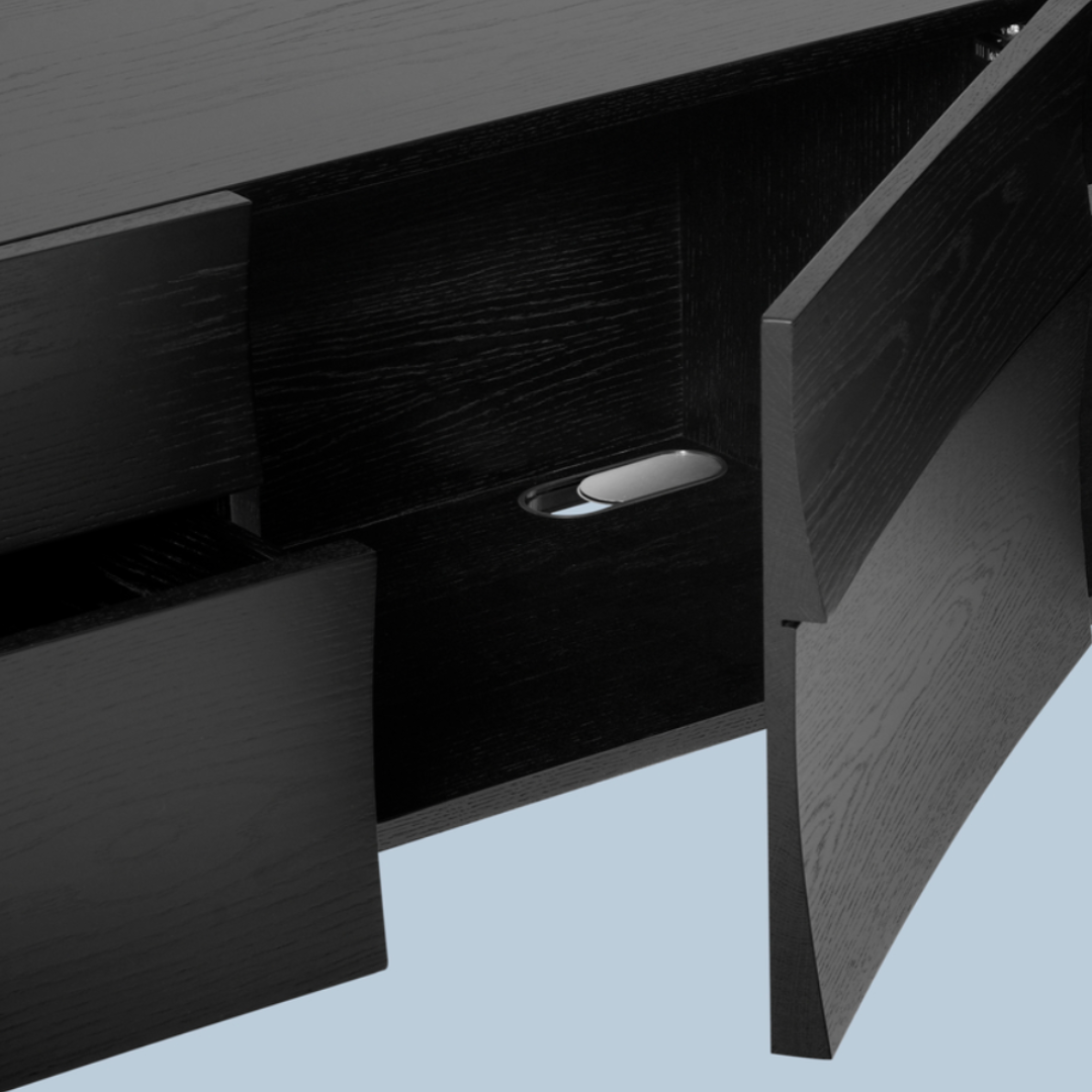 De naam Reflect komt van de rondingen en unieke diktes van de hoeken die op een onderscheidende manier spelen met reflecties van licht. Het Reflect dressoir, gemaakt van warm, natuurlijk eikenhout, heeft twee deuren die openen naar vier planken.