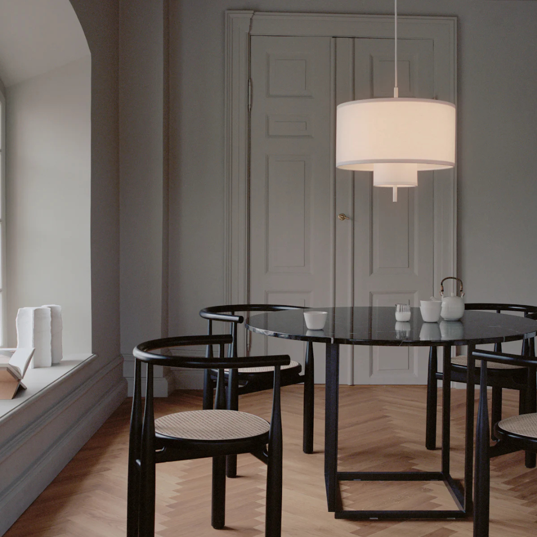 De Margin serie van New Works, ontworpen door John Astbury, heeft een gelaagde stoffen kap die het licht op een aangename, zachte manier verspreidt, wat een warme en uitnodigende sfeer in de kamer creëert. De subtiele, klassieke expressie van de kap wordt gecontrasteerd door de rechte lijn die hem kruist, waardoor de geometrische vorm van de kap wordt onderstreept en een mooi accent wordt toegevoegd aan het silhouet van het armatuur.