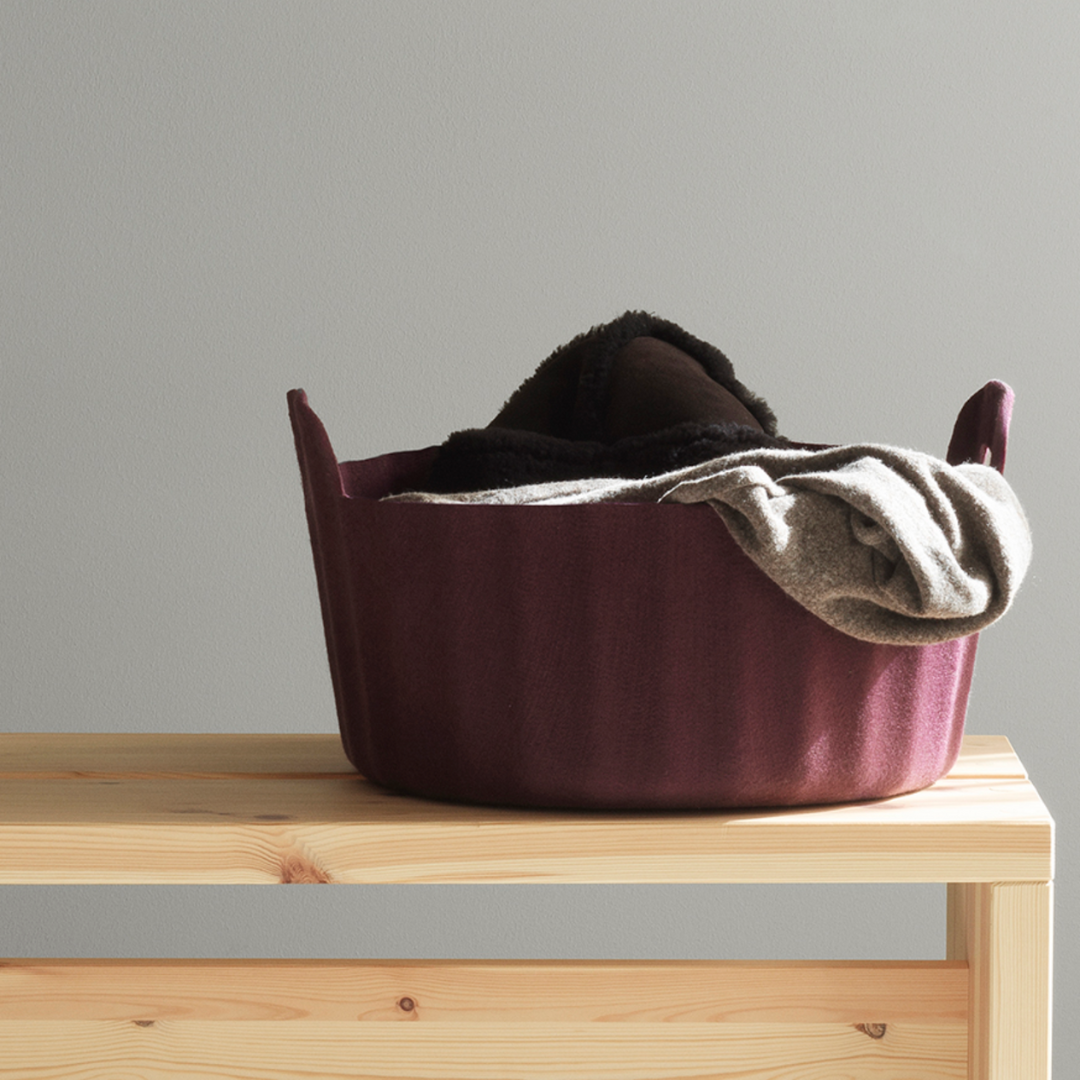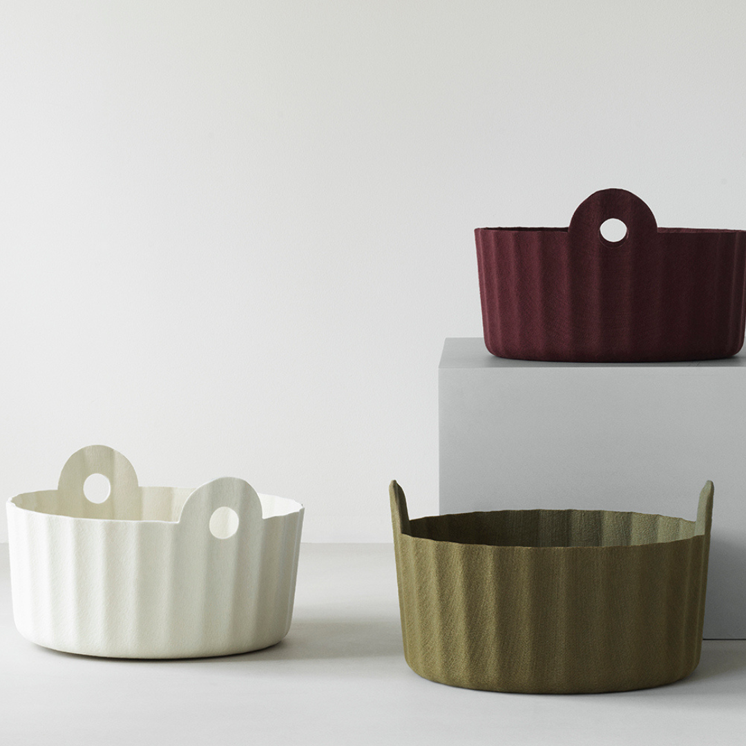 De Colu Basket, ontworpen door de Belgische ontwerper Baptiste Vandaele, combineert een eigentijdse esthetiek met praktische functionaliteit. De mand is gemaakt van gerecycled PET-vilt, een zacht maar duurzaam materiaal afkomstig van weggegooide plastic flessen.