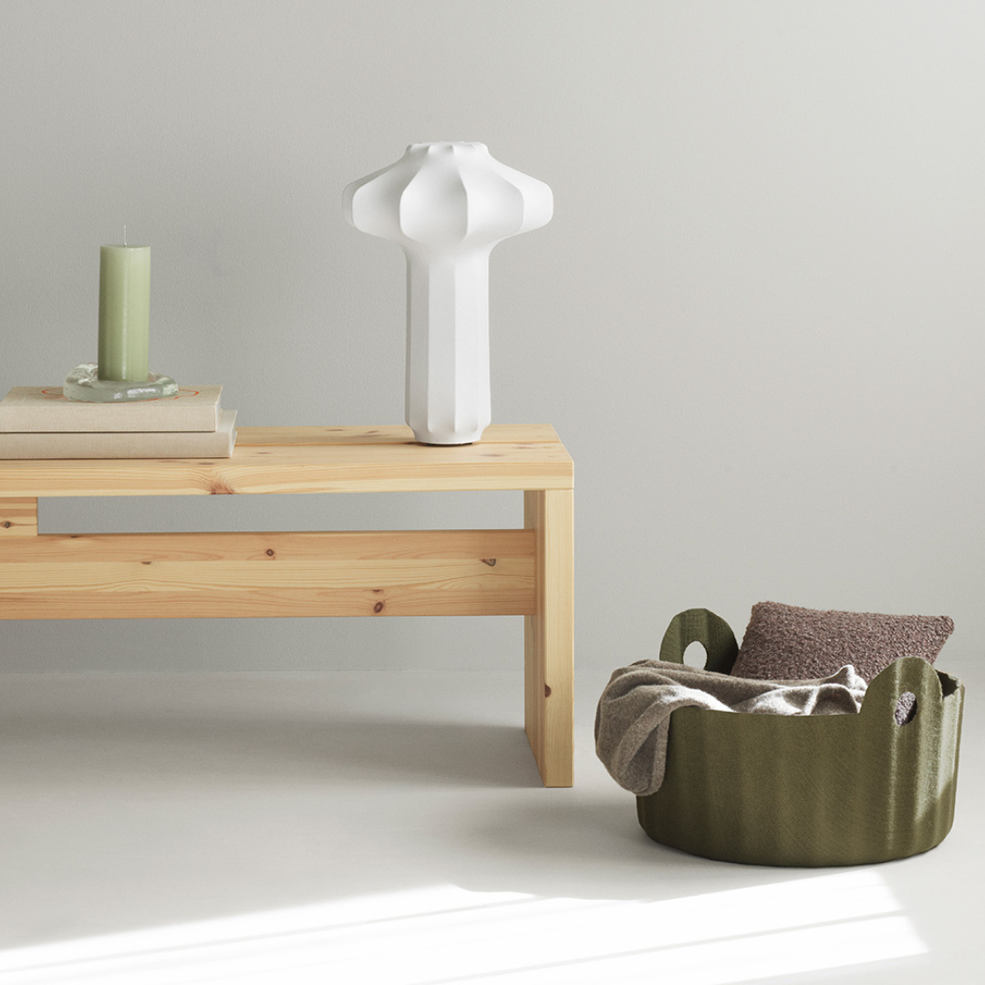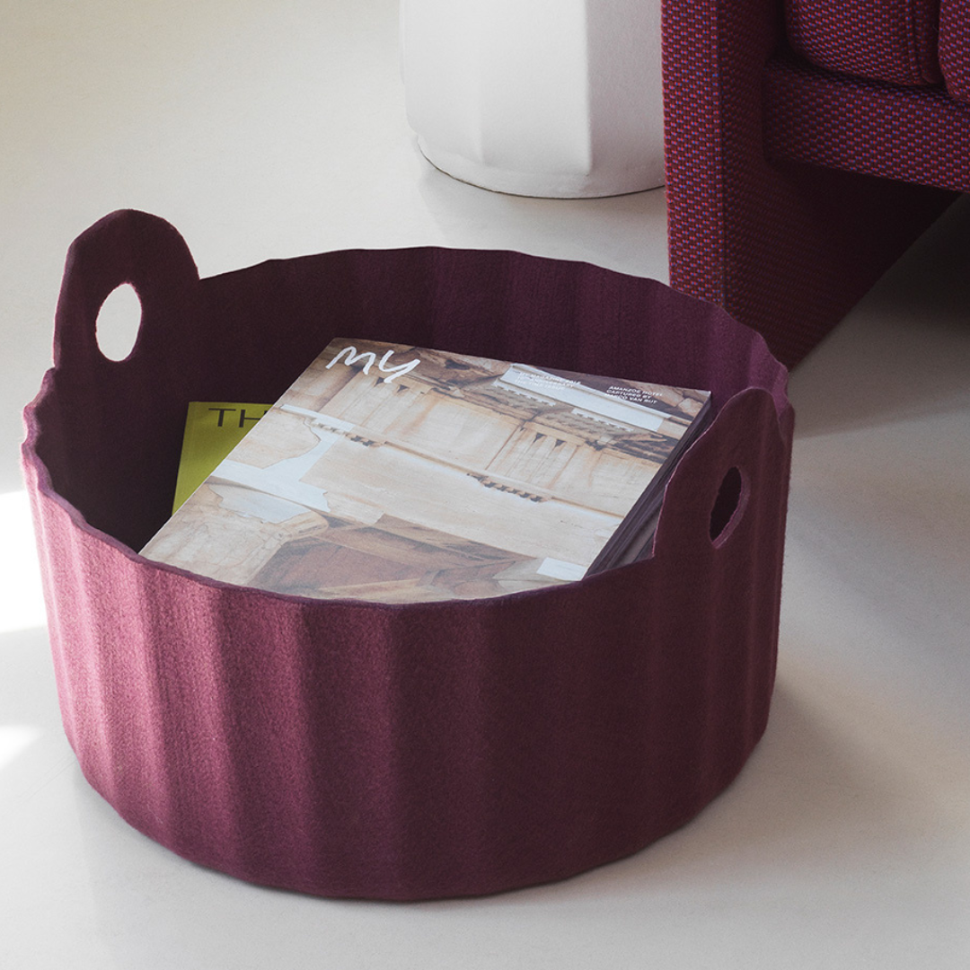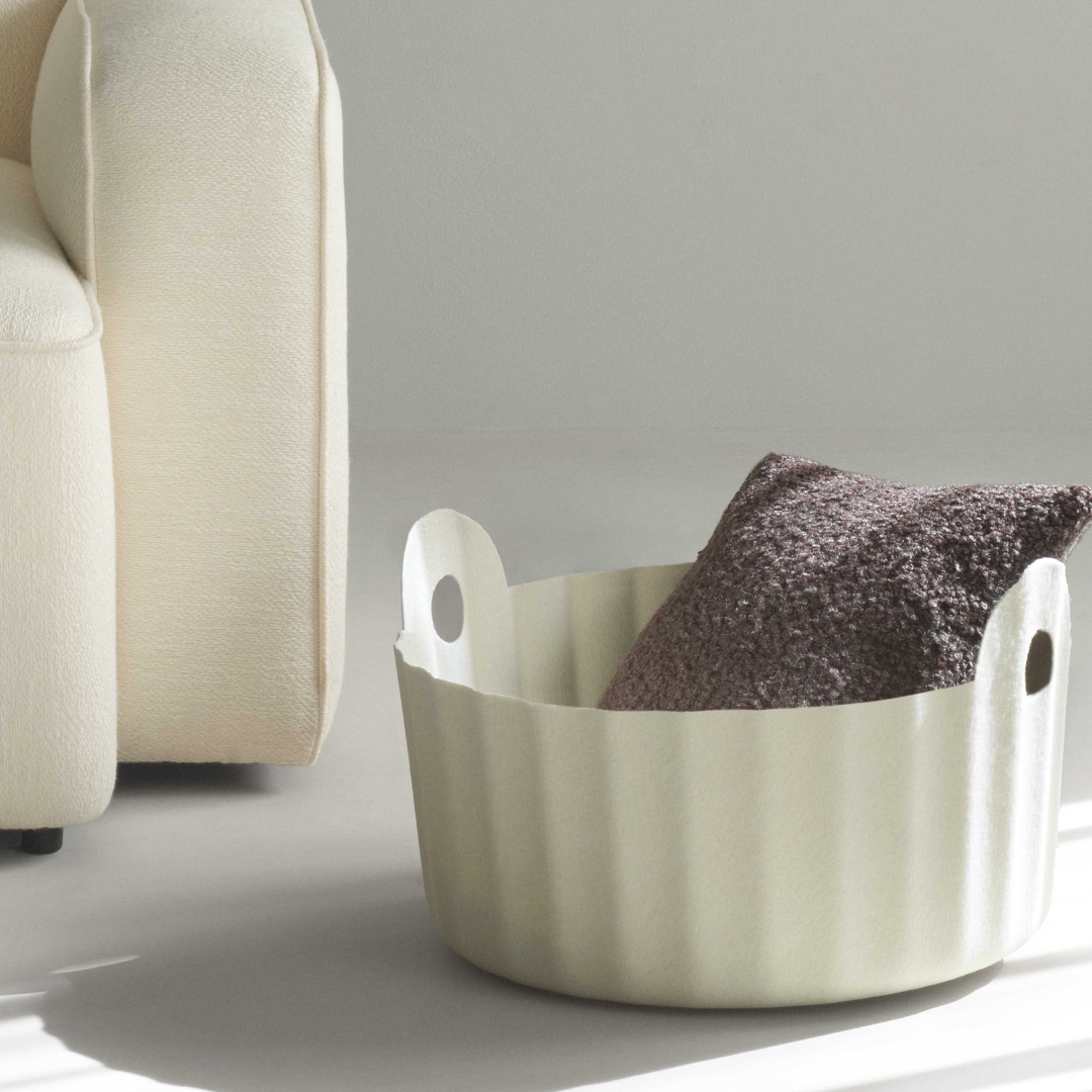 Colu Basket, ontworpen door de Belgische ontwerper Baptiste Vandaele, herinterpreteert opbergen met een mix van functionaliteit en verfijnd design. De lichtgewicht mand is gemaakt van gerecycled PET-vilt, een duurzaam maar zacht materiaal afkomstig van weggegooide plastic flessen. De mand heeft naadloos geïntegreerde handgrepen, waardoor hij perfect is voor het handig opbergen van tijdschriften, speelgoed of huishoudelijke benodigdheden.