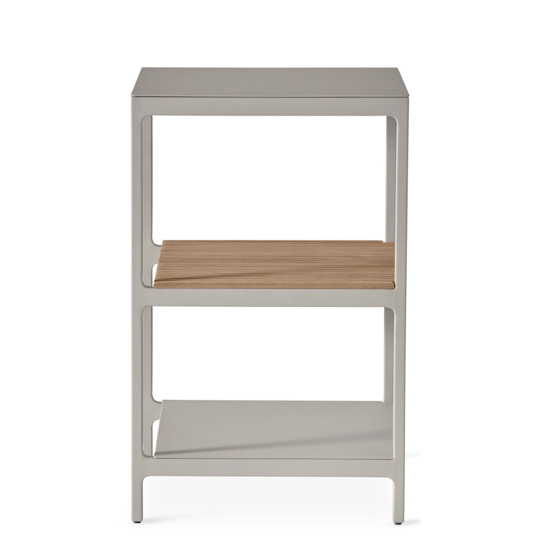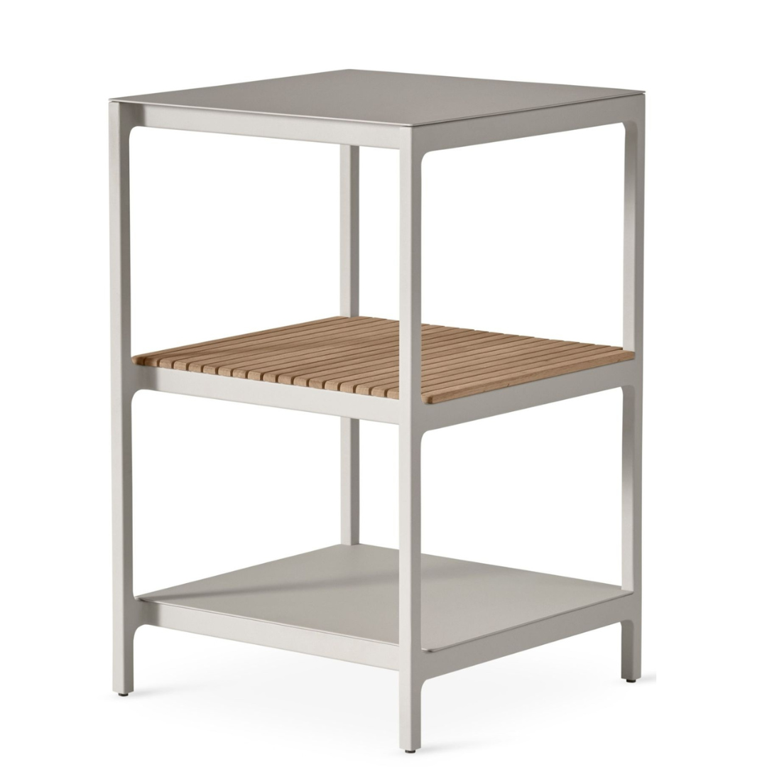 De drie niveaus bieden veelzijdige opberg- en werkruimte: ideaal voor kruiden, servies of als compact werkblad tijdens het koken in de open lucht. Het middelste schap is vervaardigd uit massieve teakhouten latten, wat een natuurlijke warmte toevoegt aan het industriële karakter van het aluminium frame.