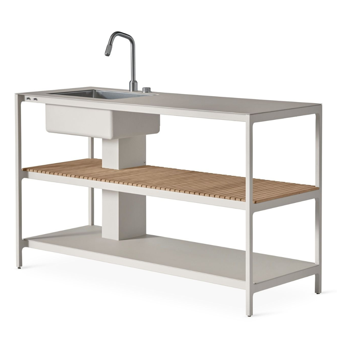 De geïntegreerde RVS spoelbak, inclusief hoogwaardige Vipp mengkraan, maakt buiten koken en voorbereiden bijzonder comfortabel. Drie functionele niveaus – het werkblad en twee ruime schappen – bieden voldoende ruimte voor keukengerei, servies en ingrediënten. Het middelste schap, uitgevoerd in massieve teaklatten, voegt warmte en karakter toe aan het ontwerp.