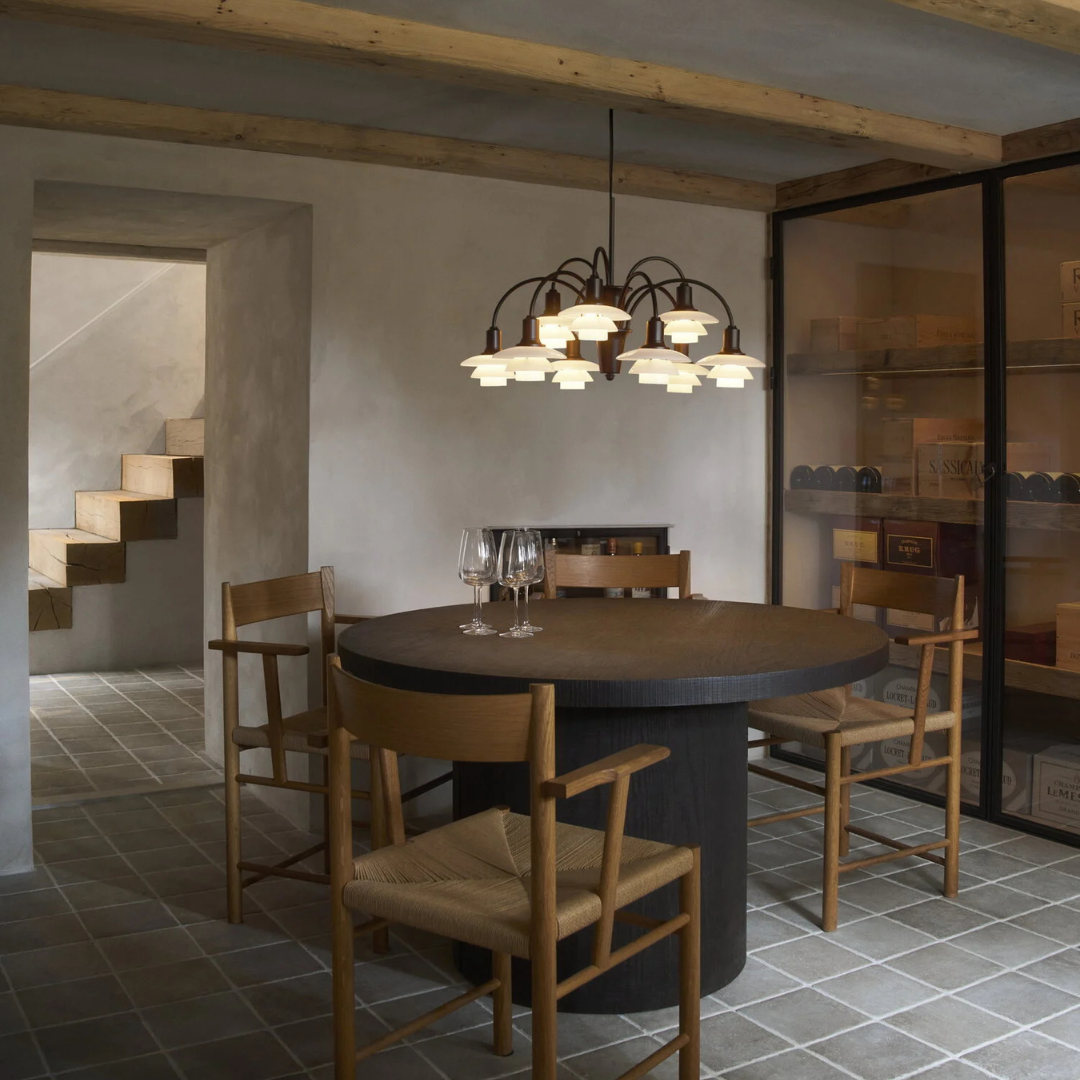 De PH 1/1 Chandelier van Louis Poulsen is een indrukwekkend lichtobject dat designgeschiedenis en verfijnde verlichting samenbrengt. Ontworpen door Poul Henningsen, bestaat deze kroonluchter uit negen mondgeblazen glazen kappen in een warme dusty terracotta tint, gedragen door een donker gepatineerd messing frame.