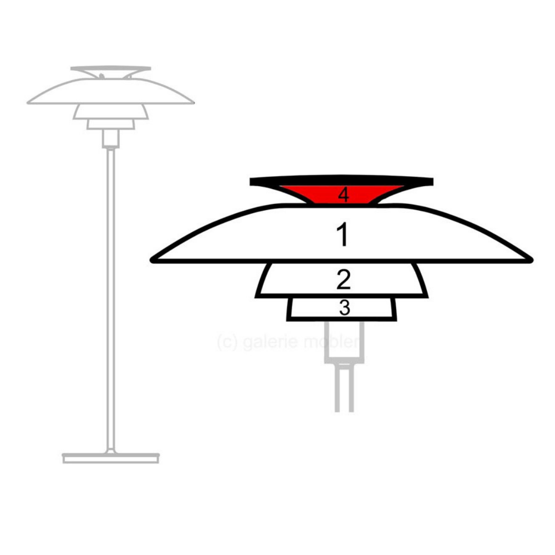 De verchroomde stalen voet geeft de vloerlamp een moderne, industriële look en de rode kleur van de topreflector zorgt voor een warme gloed. De PH 80 werd postuum uitgebracht in 1974 ter gelegenheid van het tachtigste geboorte jaar van Poul Henningsen.
