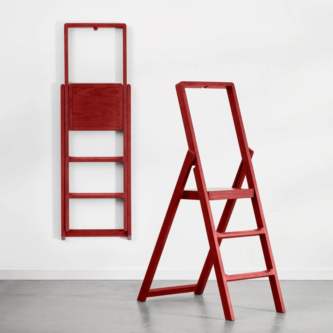 De step ladder is er in 6 uitvoeringen: zwart of wit gebeitst beukenhout, naturel eiken, licht eiken en  donker-eiken en donker rood variant. Ook zonder haak kan de ladder plat tegen de muur staan, pas wel op voor kinderen en huisdieren. De ladder kan eventueel omvallen.