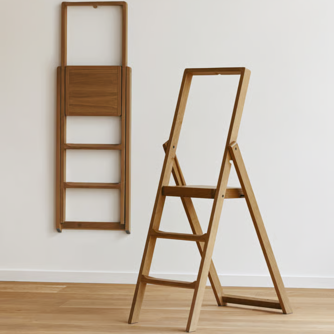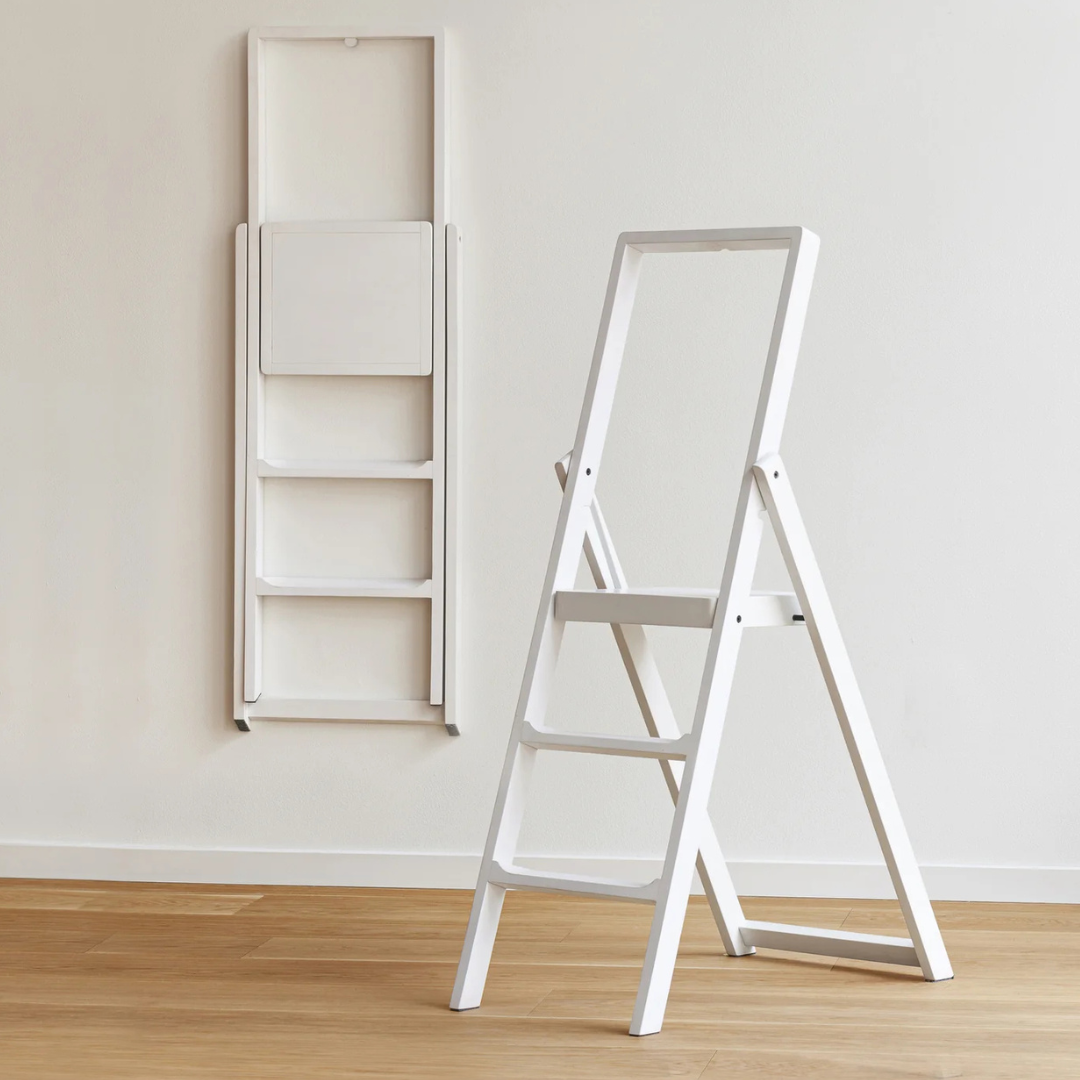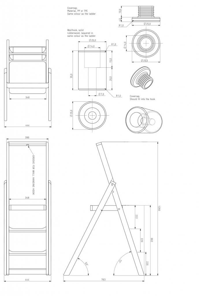 De step ladder is er in 6 uitvoeringen: zwart of wit gebeitst beukenhout, naturel eiken, licht eiken, donker eiken en een rood variant. Ook zonder haak kan de ladder plat tegen de muur staan, pas wel op voor kinderen en huisdieren. De ladder kan eventueel omvallen.