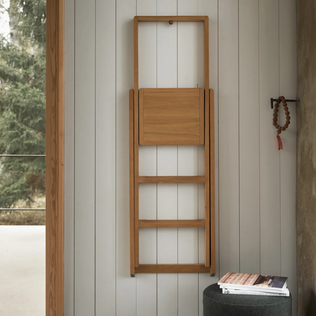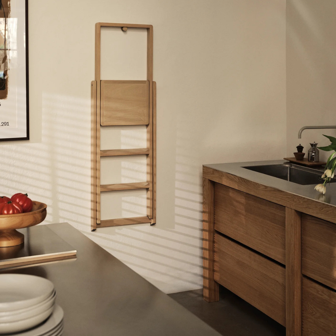 Gemaakt van massief eiken (eiken en groen variant) of de beukenhouten variant in het wit of zwart gebeitst. De ladder wordt geleverd met een haak in bijpassende materiaal en afwerking. Deze haak maakt het mogelijk om de ladder op te hangen aan de muur als een decoratieve blikvanger. Op deze manier is de ladder altijd binnen hand bereik.