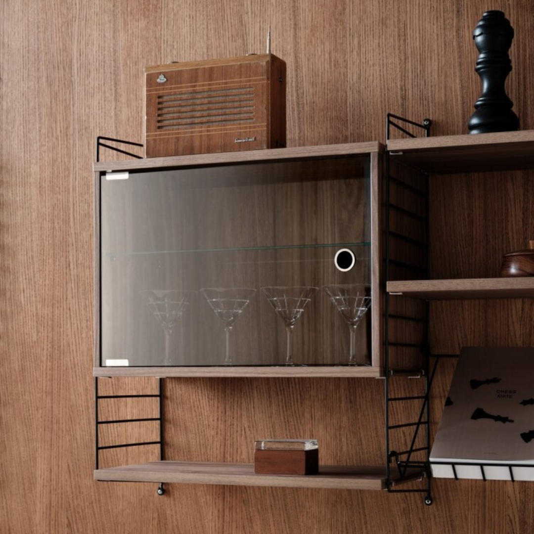 De Vitrinekast met Glazen Draaideur is verkrijgbaar in een breedte van 58 cm en een diepte van 30 cm. Het is compatibel met alle 30 cm diepe draad- en plexpanelen van String® System. Het toevoegen van een opvallend element, zoals een vitrinekast, vergroot de visuele aantrekkingskracht van uw plank en biedt tegelijkertijd extra opslagruimte en de mogelijkheid om delicate items tentoon te stellen. De deur kan aan beide zijden van de kast gemonteerd worden. Het bevat een verstelbare binnenplank en de interne afmetingen zijn b54 x d26 x h38 cm. De kast wordt ongemonteerd geleverd.