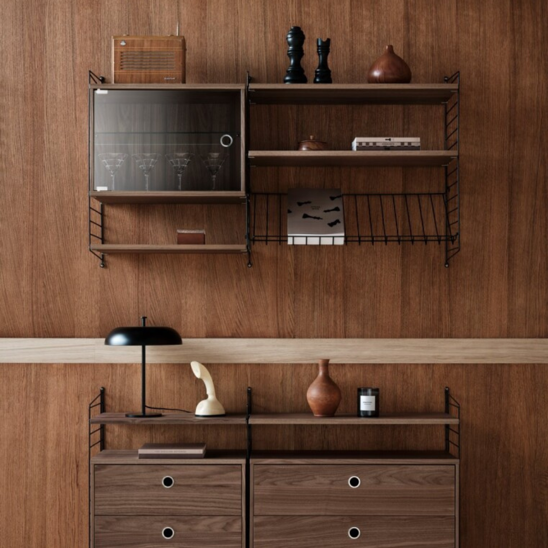 Een gelieft Zweeds opbergsysteem uit 1949 ontworpen door Nils Strinning, een nieuwe toevoeging van het uitgebreide assortiment planken voor je decorative items.