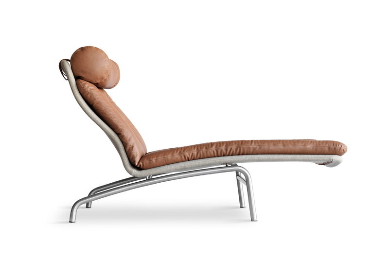 De Vodder chaise longue is een prachtig gebogen stoel met een cilindrische hoofdsteun om het comfort te optimaliseren. De luxe lederen bekleding en strake stalen poten maken de elegante look compleet.