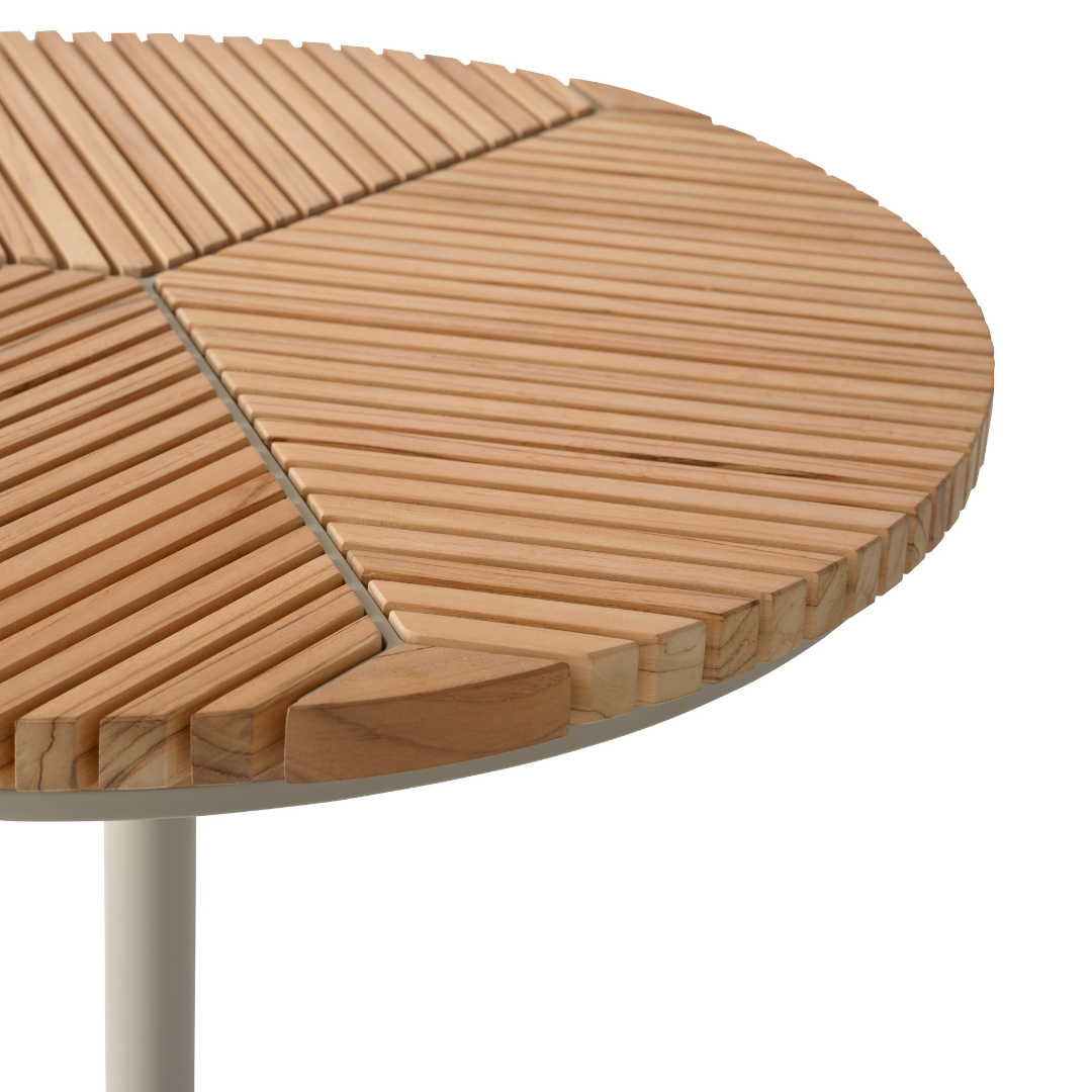 Afmetingen: H. 72,6 cm  Ø75 cm. Materiaal: teak tafelblad, licht grijs poeder gelakt aluminium frame.