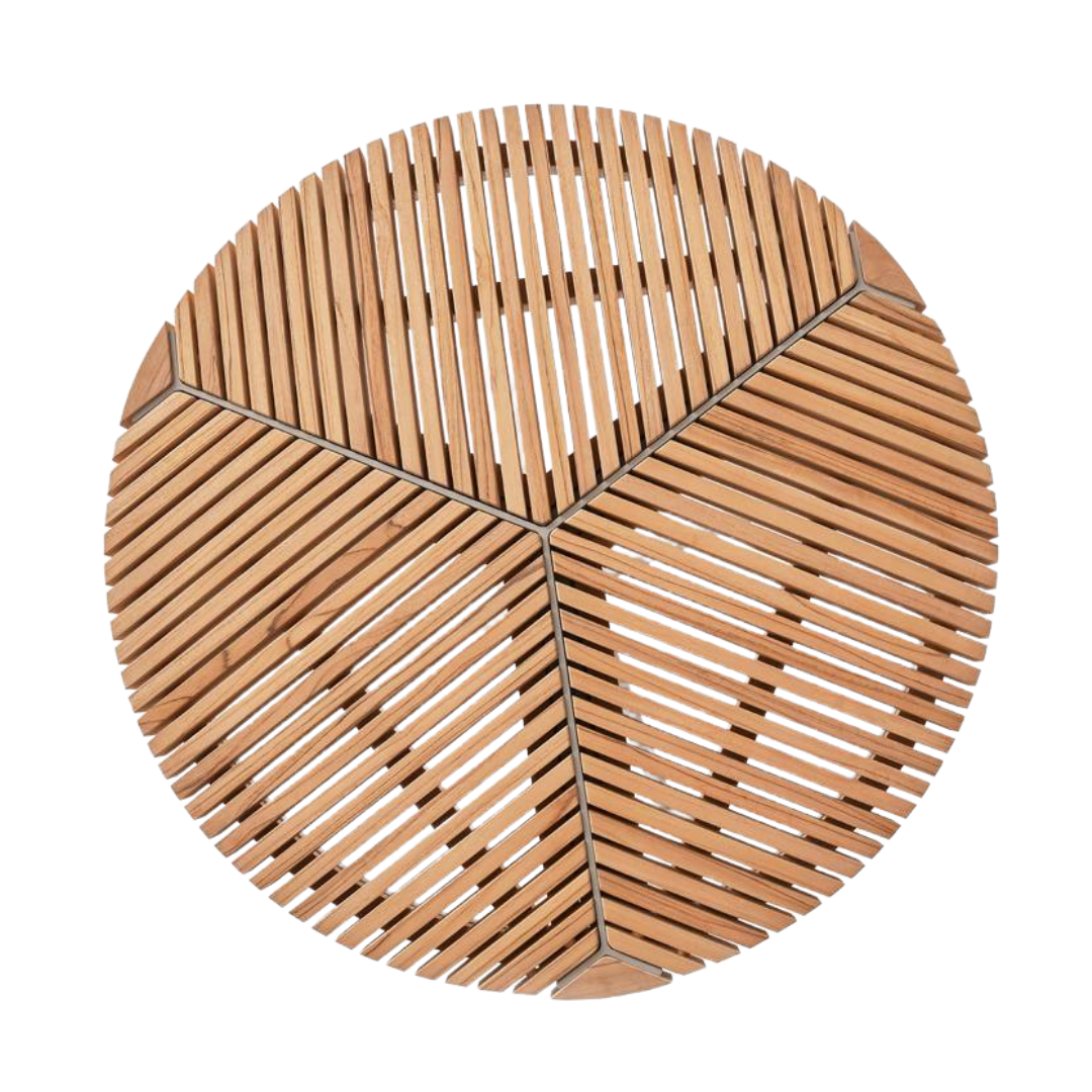 De Vipp 716 Outdoor Coffee bestaande uit een driepoot aluminium frame met een teak tafelblad in Ø90 cm, de combinatie biedt de salontafel een duurzame en elegante uitstraling voor uw buitenruimte.de tafel is ook mooi te combineren met de Vipp 714  salontafel.