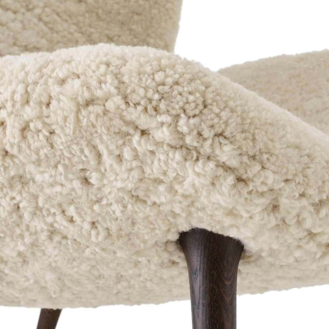 Net als zijn voorgangers is de Lodge loungestoel met lage rugleuning verkrijgbaar in een wolsoort met hoge dichtheid, afkomstig van gekruiste Australische schapen, met een natuurlijk krullende textuur.