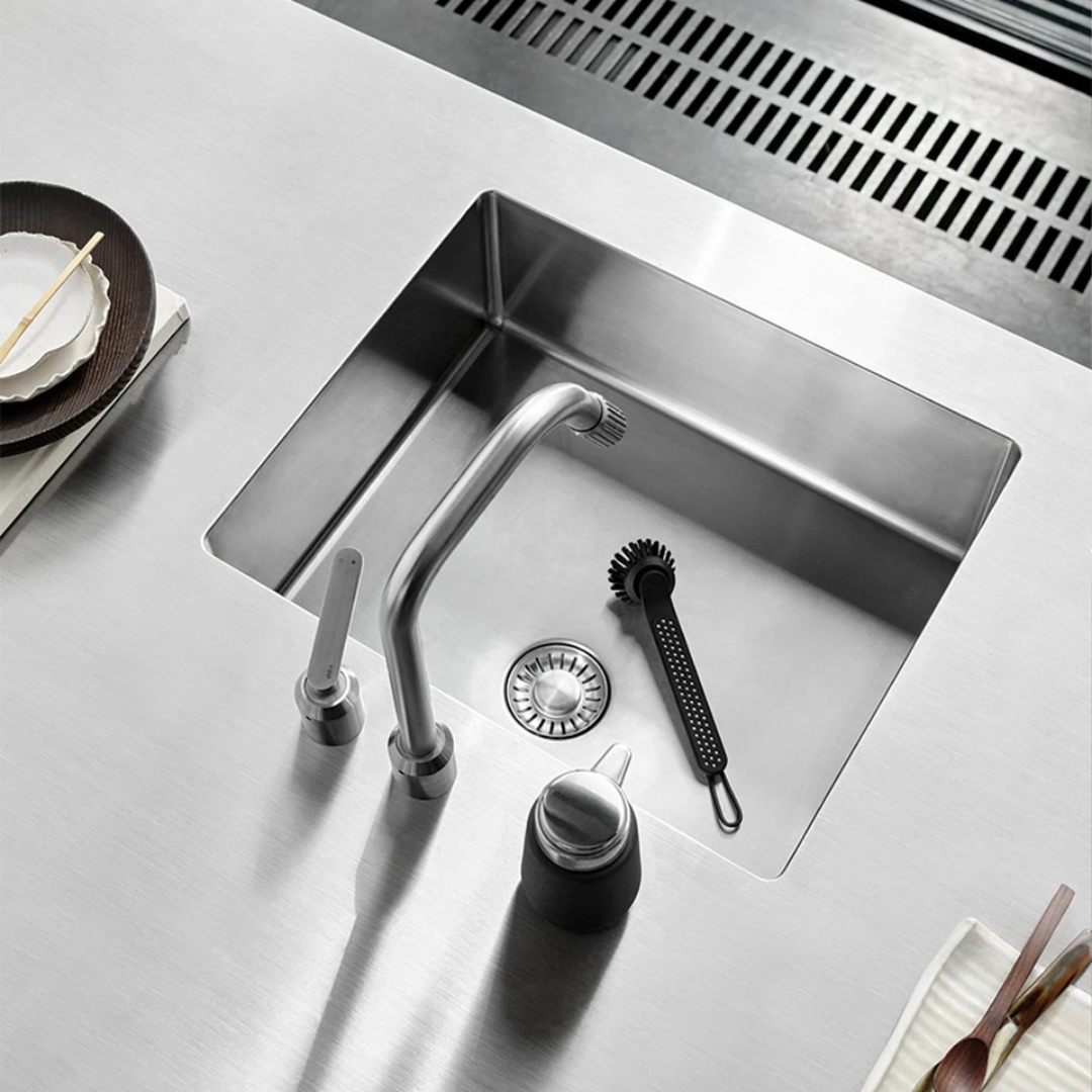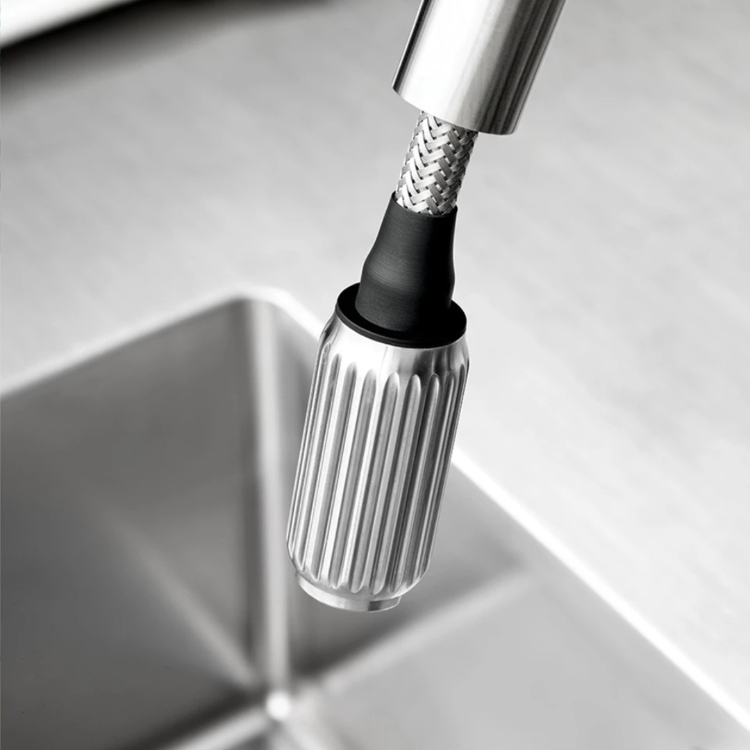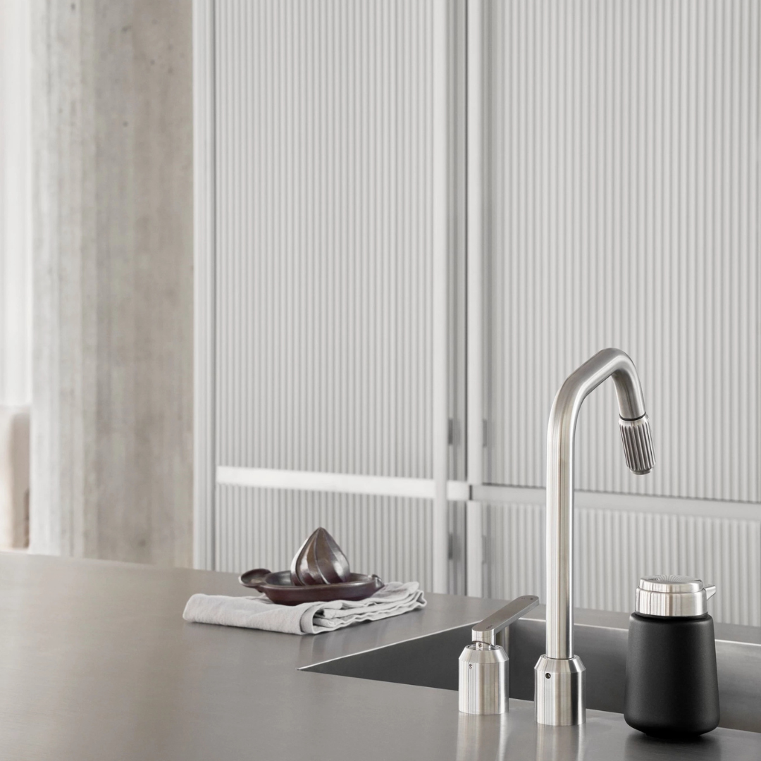 De Vipp 901 mengkraan is gemaakt van roestvrij staal en past perfect in de moderne keuken en heeft een hoge functionaliteit. Een enkele hendel zorgt voor de bediening van het warm en koud water. De kraan heeft een uittrekbaar deel met een flexibele slang, praktisch in de keuken. Het is een technisch hoogstandje dat borg staat voor jarenlang onderhoudsvrij gebruiksplezier.De Vipp 901 keukenmengkraan heeft ook een keramisch uitloop waardoor deze geen onderhoud nodig heeft en er voor zorgt dat ook na vele jaren gebruik er een een gelijkmatige water stroom is en er geen druipels aan de kraan blijven hangen.