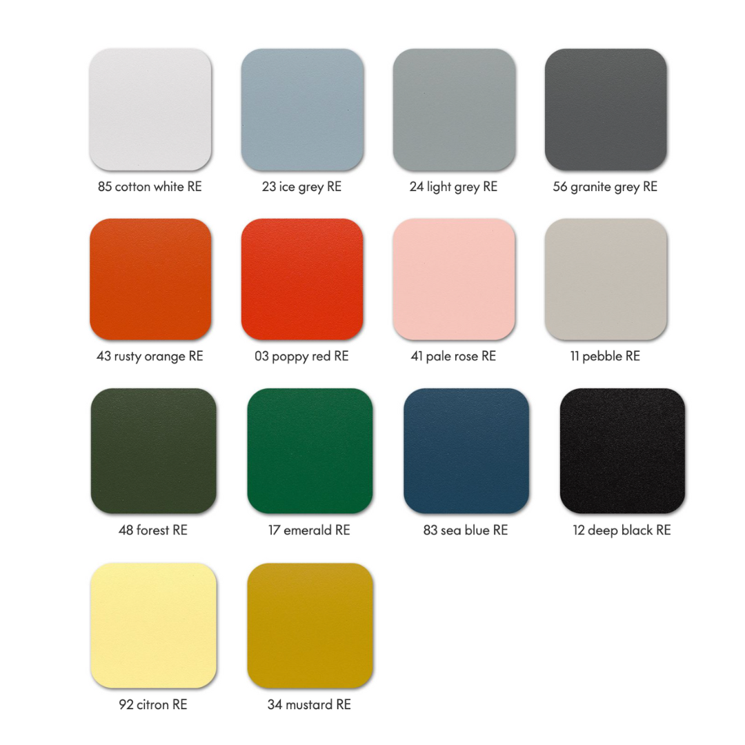 Door de samenstelling van de gerecyclede materialen worden de verschillende kleurvarianten van de zitschalen afgewisseld met kleine pigmentvlekken.