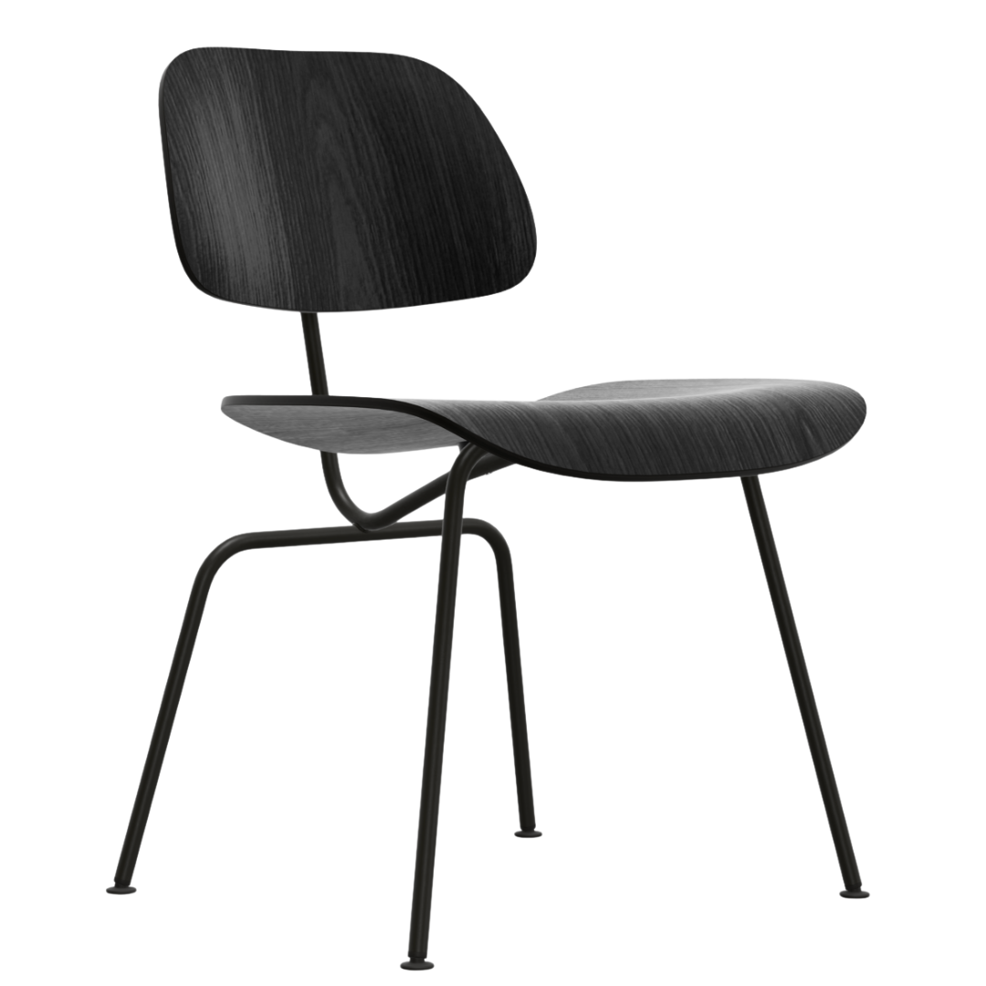 De DCM, dat staat voor Dining Chair Metal, met een rugleuning en zitting die is vervaardigd uit gevormd multiplex (essenhout) en de stoel is verkrijgbaar in naturel of zwart gebeitst. Het onderstel is gemaakt van verchroomd metaal.