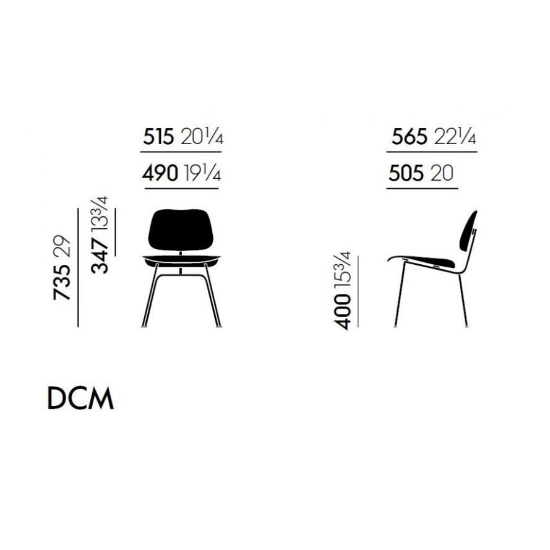 De Vitra DCM (Dining Chair Metal) is een serie stoelen waarin de Eames een karakteristieke zitting en rugleuning van voorgevormd multiplex, destijds een totaal innovatief materiaal voor de meubelproductie, combineerden met een serie verschillende onderstellen. De DCM heeft de eenvoudige basis van een stalen buis deze materiaalmix die zorgt voor een interessant en zeer aangenaam contrast.