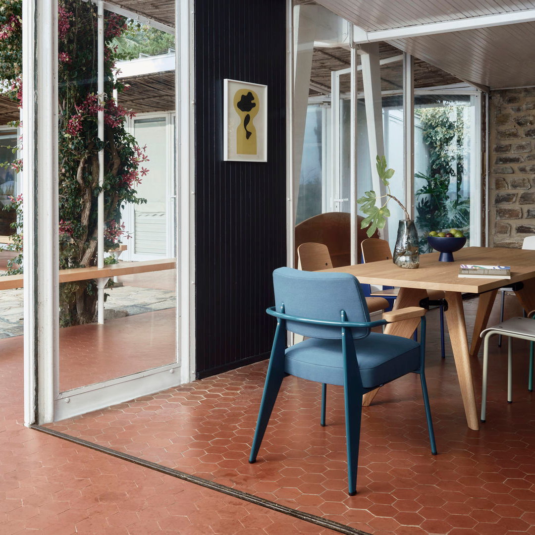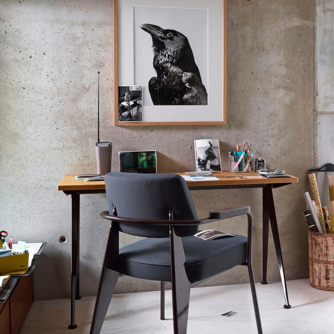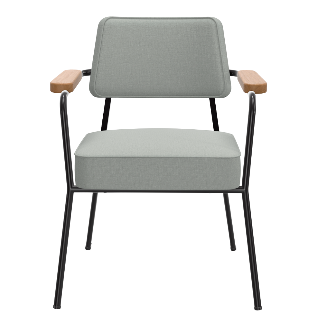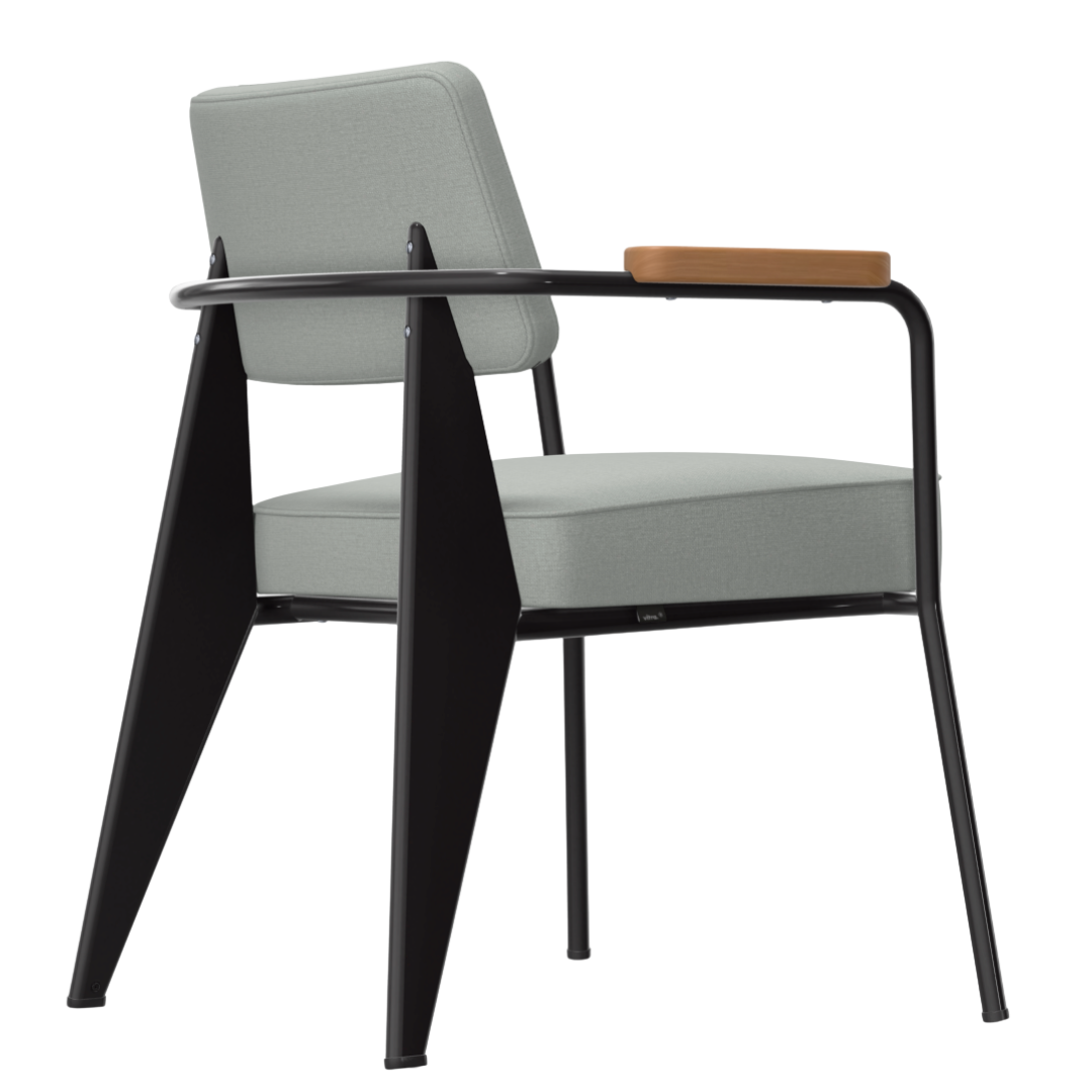 Prouvé’s ontwerpfilosofie is direct zichtbaar: elk element heeft een reden. Het slanke stalen onderstel en de gevormde constructie zorgen voor stabiliteit en karakter, terwijl de warme houten armleuningen een subtiel contrast bieden. Het resultaat? Een perfecte balans tussen industrieel en natuurlijk.