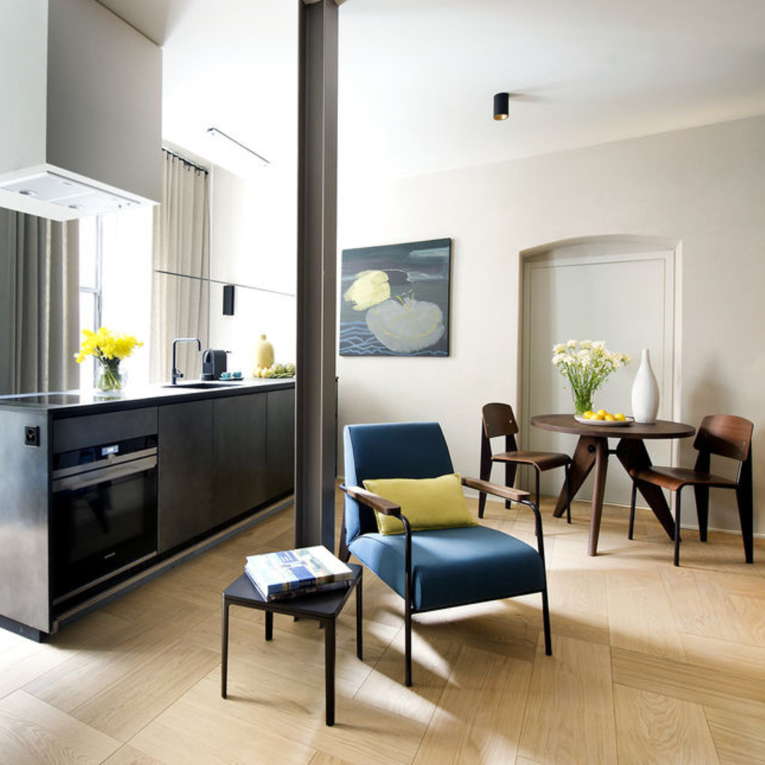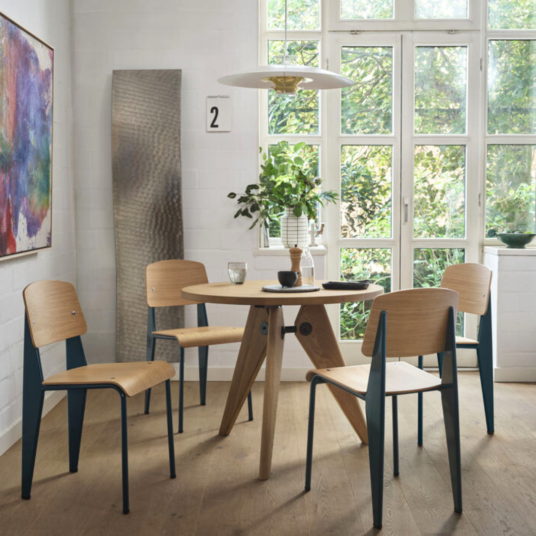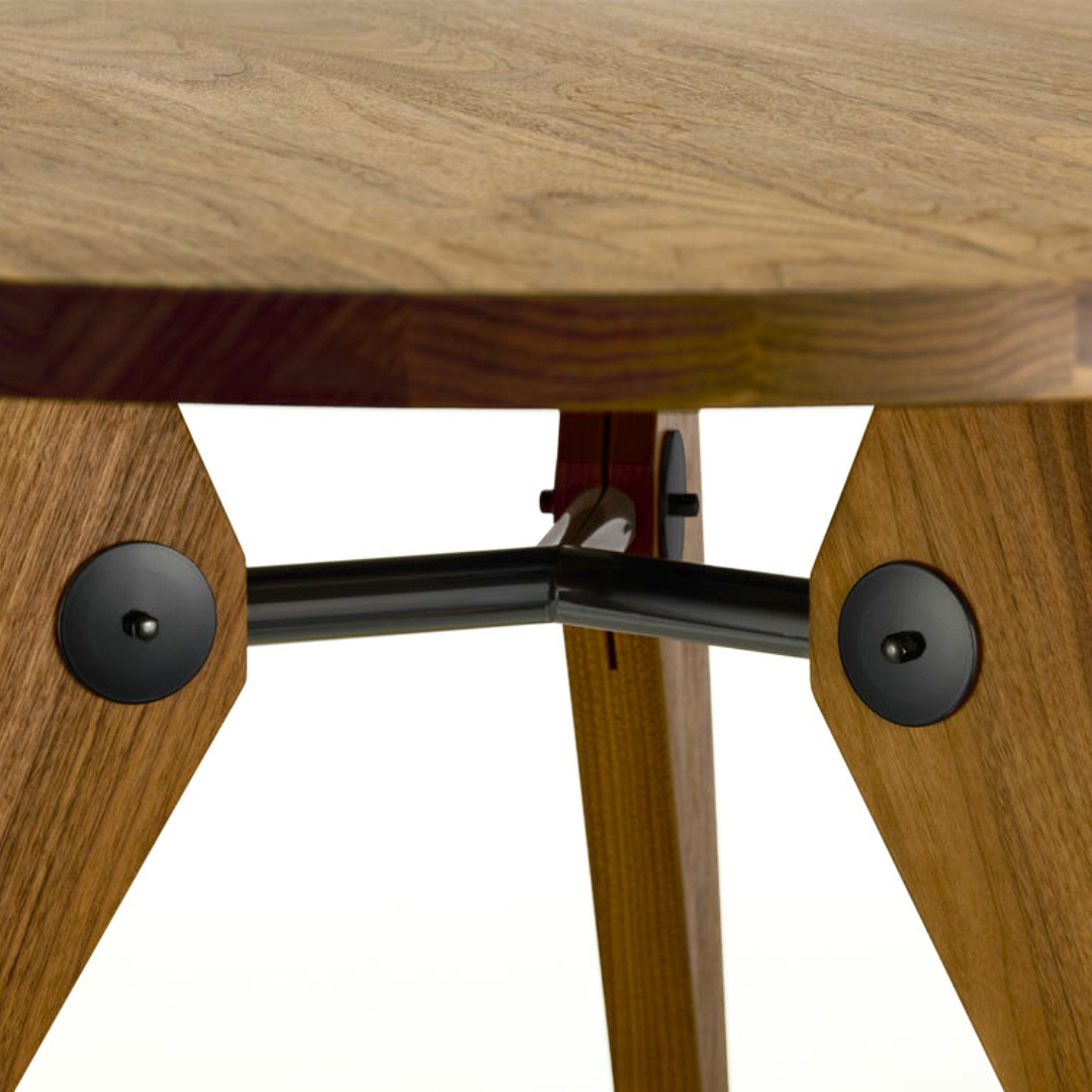 Deze massief eiken/noten tafel genaamd de Guéridon, werd eind jaren veertig door de ontwerper en ingenieur Jean Prouvé voor de Universiteit van Parijs werd ontworpen, de tafel is een demonstratie van duidelijke structurele basis principes. Het is een variatie op Prouvé's architectonisch ontwerp serie, en is in een natuurlijk materiaal gemaakt , waaruit blijkt dat moderne tafels niet noodzakelijk van staal en glas hoeven zijn gemaakt.