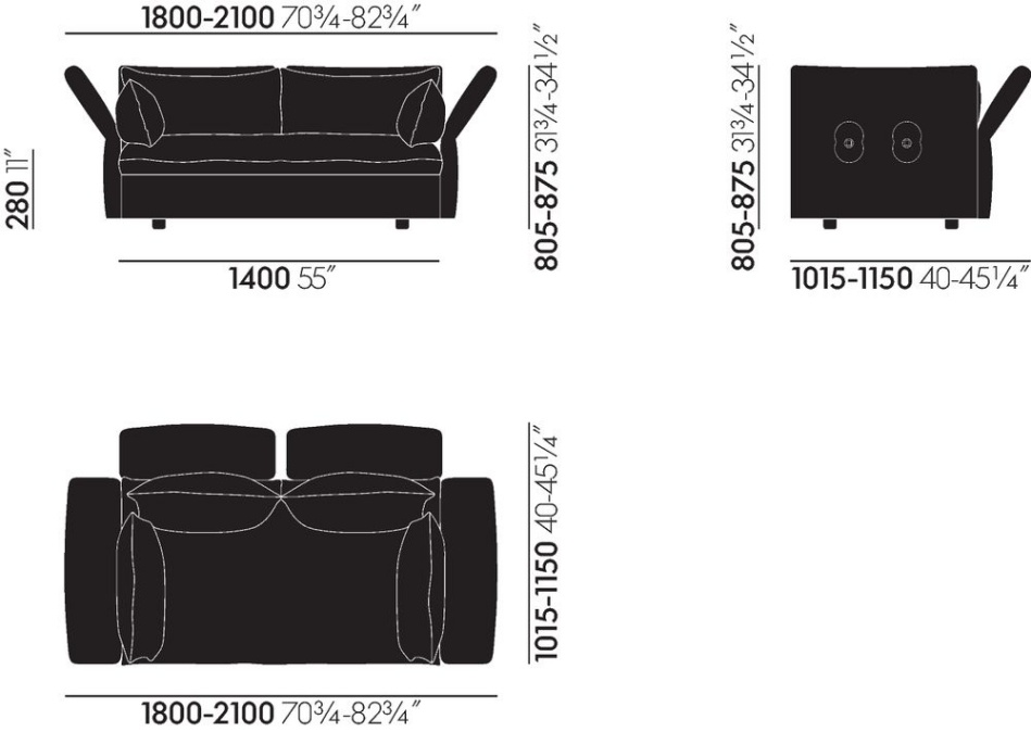 Afmetingen:Diepte / Lengte 101.5 - 115 cm. Breedte 180 - 210 cm. Hoogte 80.5 - 87.5 cm.