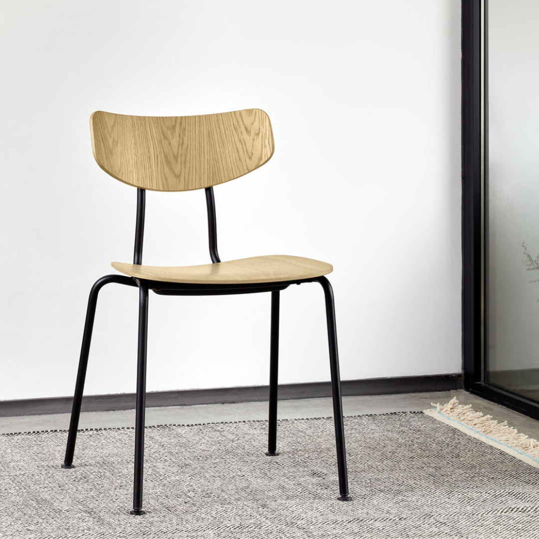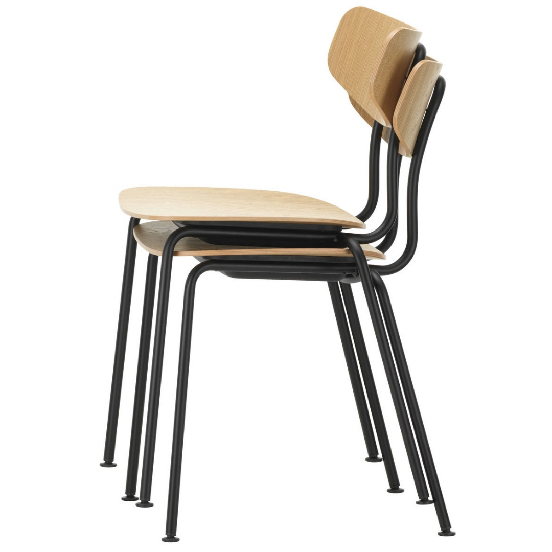 De zitschalen van de Moca stoel zijn verkrijgbaar in natuurlijk of donker eiken fineer, en de basis is verkrijgbaar in een verchroomde versie of met een zeer robuuste, poedercoating mat gelakte afwerking.