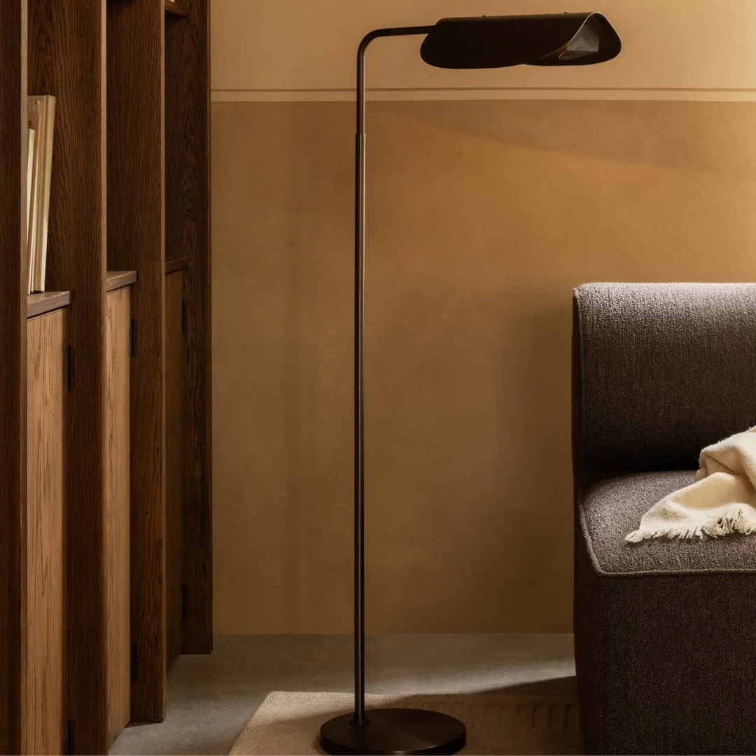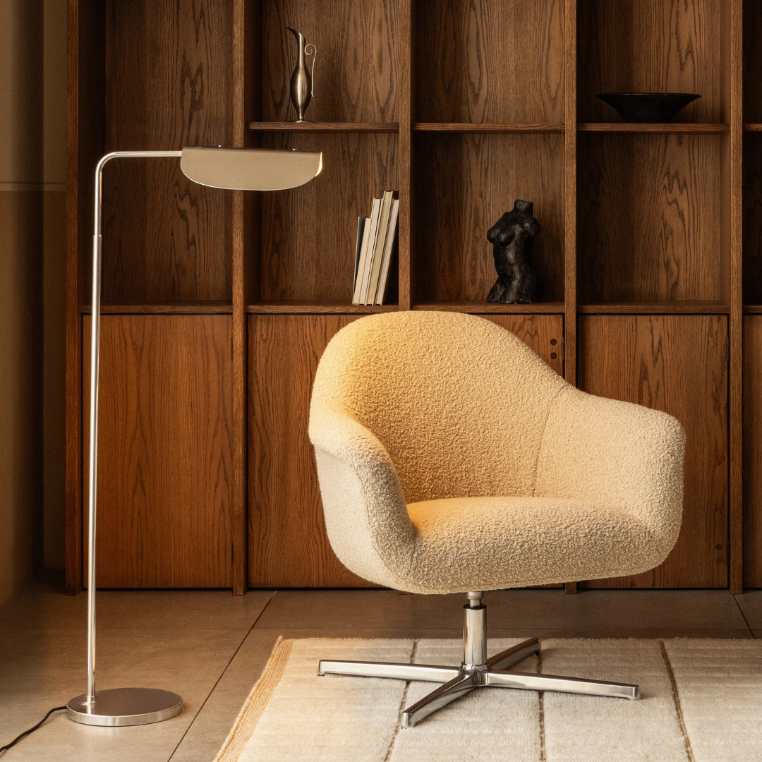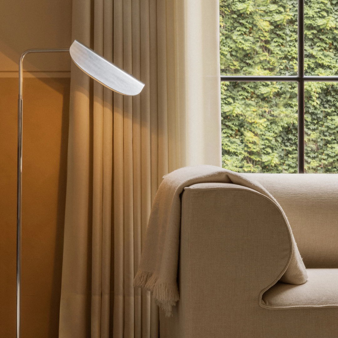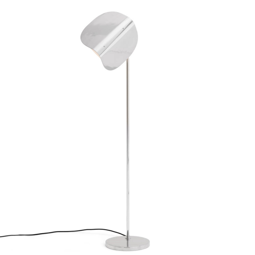 De combinatie van strakke lijnen en organische vormen geeft de lamp een tijdloze uitstraling. Verkrijgbaar in gepolijst aluminium met witte binnenzijde of in een warme bronskleur met zwarte binnenzijde, past de Wing Floor Lamp moeiteloos in zowel moderne als klassieke interieurs.