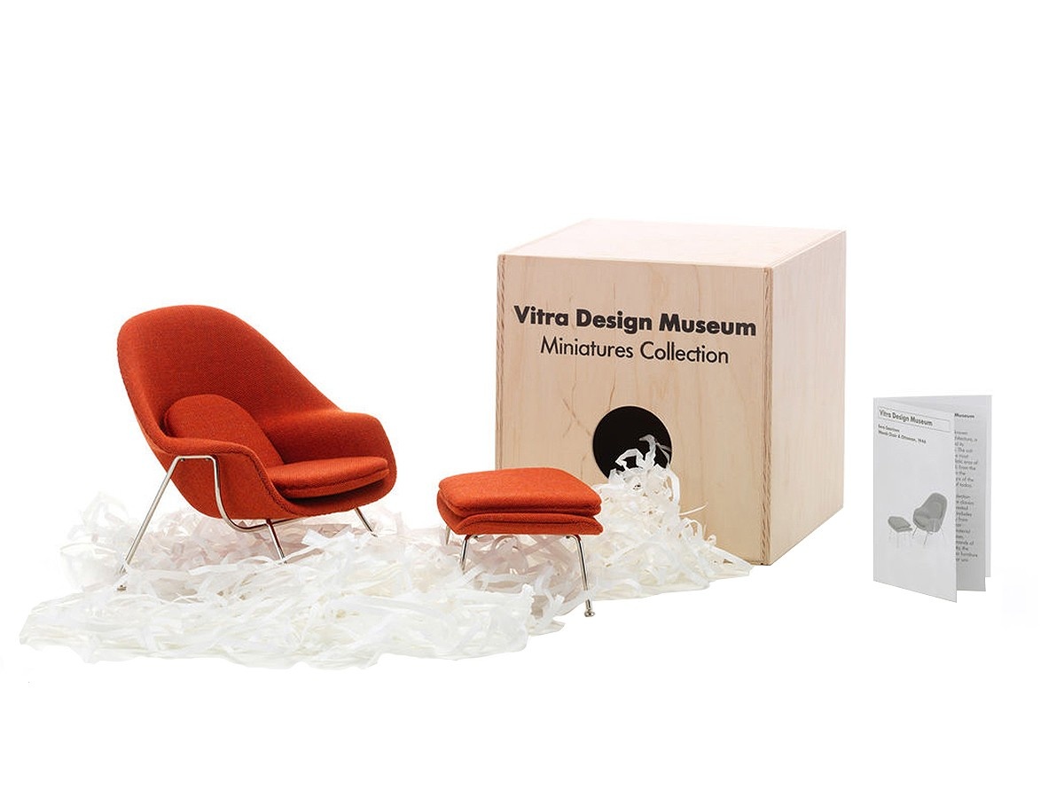 De Vitra Miniature Womb Chair & Ottoman is een perfect voorbeeld van hoe uitgebreid deze aandacht voor detail is, met de miniatuurstoel bedekt met dezelfde stof als zijn grote broer en de frames en afwerking tot in het kleinste detail gereproduceerd.