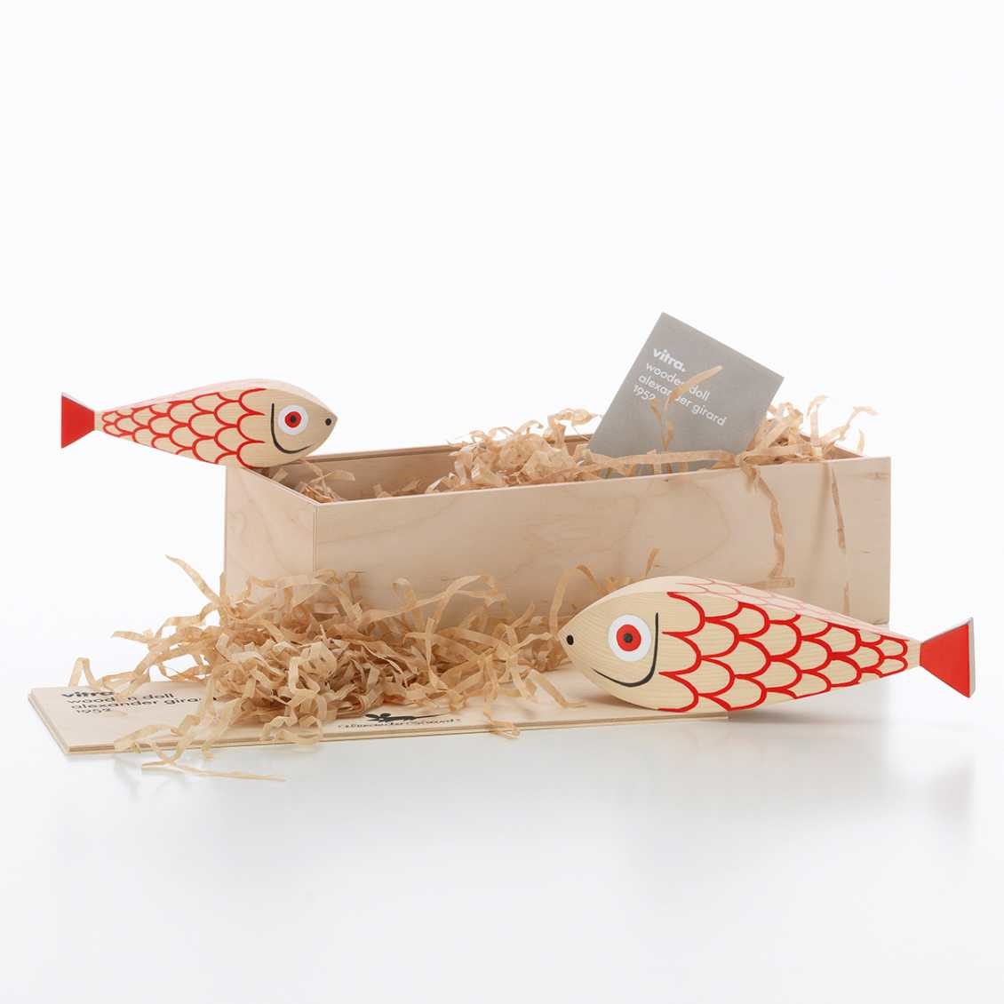 De twee vissen " Mother&Child " zijn de enige liggende horizontale figuren binnen de wooden dolls familie en zijn verzwaard met een metalen gewicht voor extra stabiliteit.
